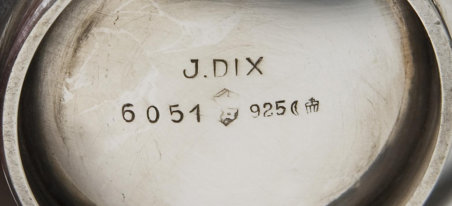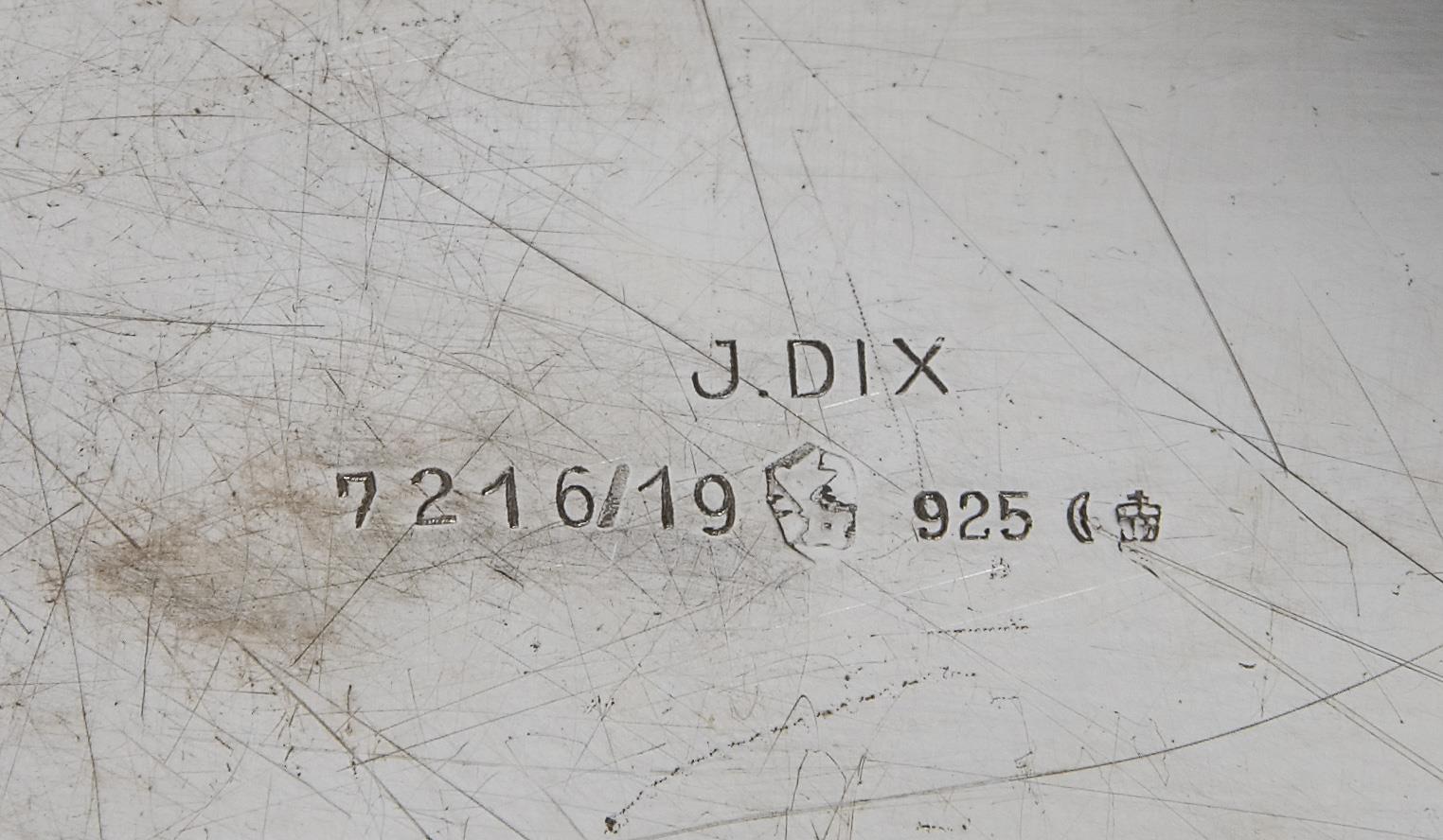 Tray, milk jug, sugar bowl. Timeless smooth shape, high quality work. Hallmarks: Crescent and crown, fineness, maker's mark, J. Dix signature, model nos. 6050, 6051, 7216/19.