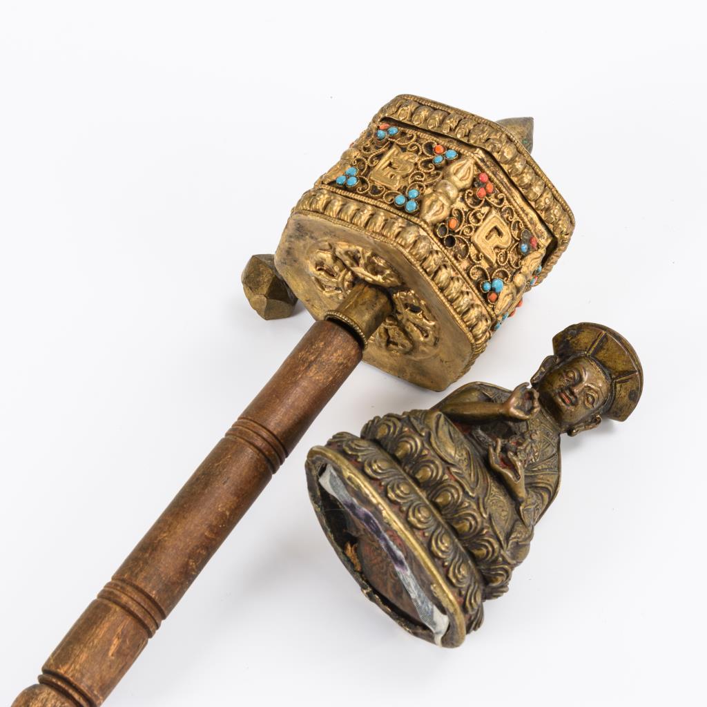 Gebetsmühle: geprägtes Messing mit Korallen und Türkisbesatz. Papier mit Spruch innen, Kapsel offen. L 25 cm. / Messingfigur eines Mönches. Reste roter Bemalung. Boden verschlossen. H 10 cm.