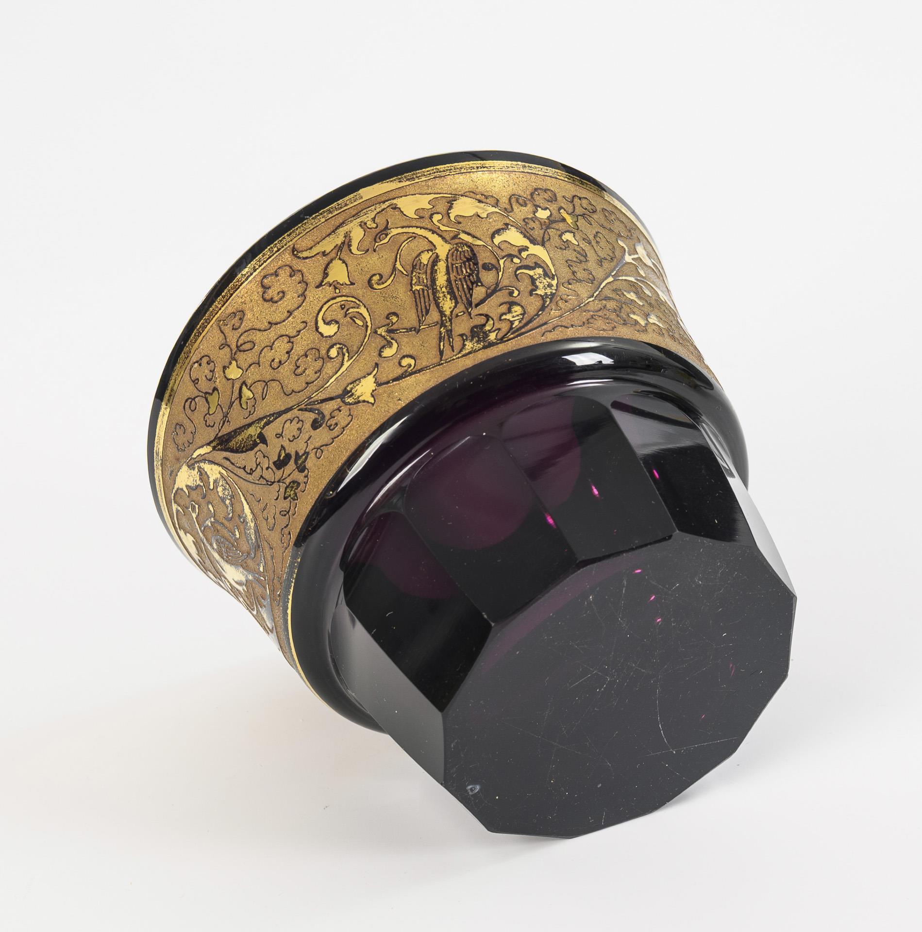Conical vase, faceted at the base with oroplastic bird decoration.