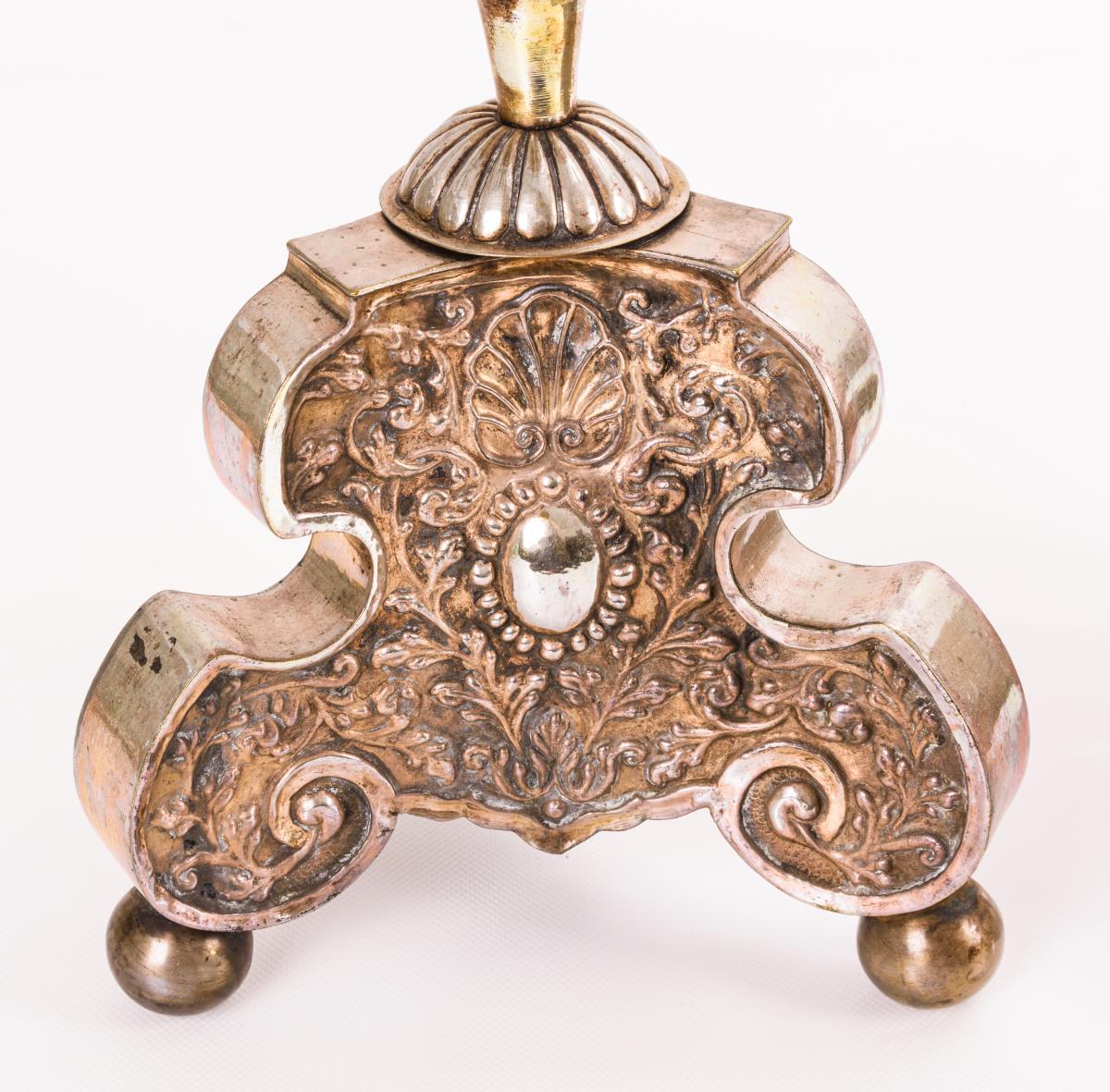 Aluminium-Wachsteller und Appliken-Verschraubungen ergänzt, kleinere Risse an den Sockeln teils gelötet, stärkere Alters-/Gebrauchsspuren.