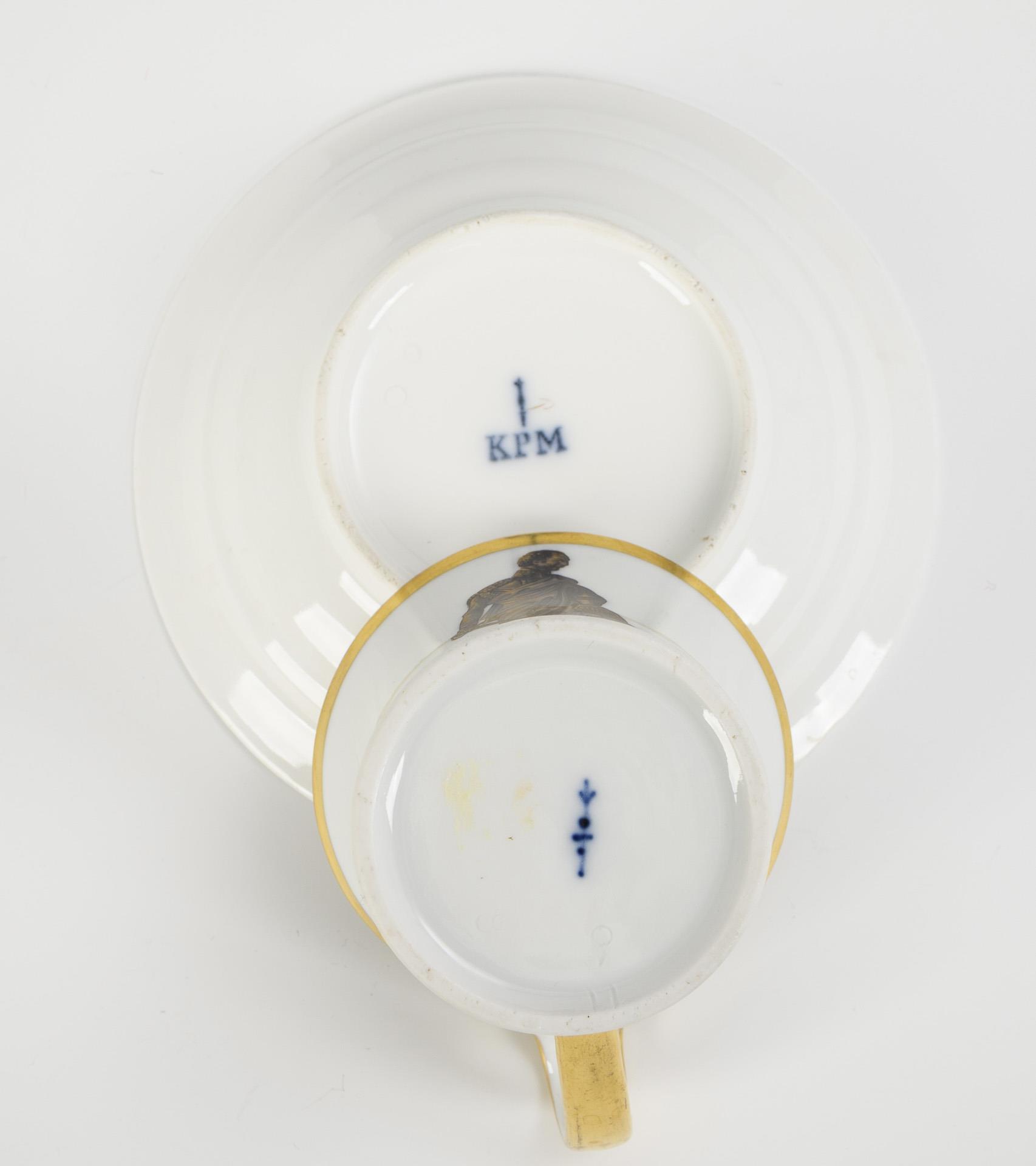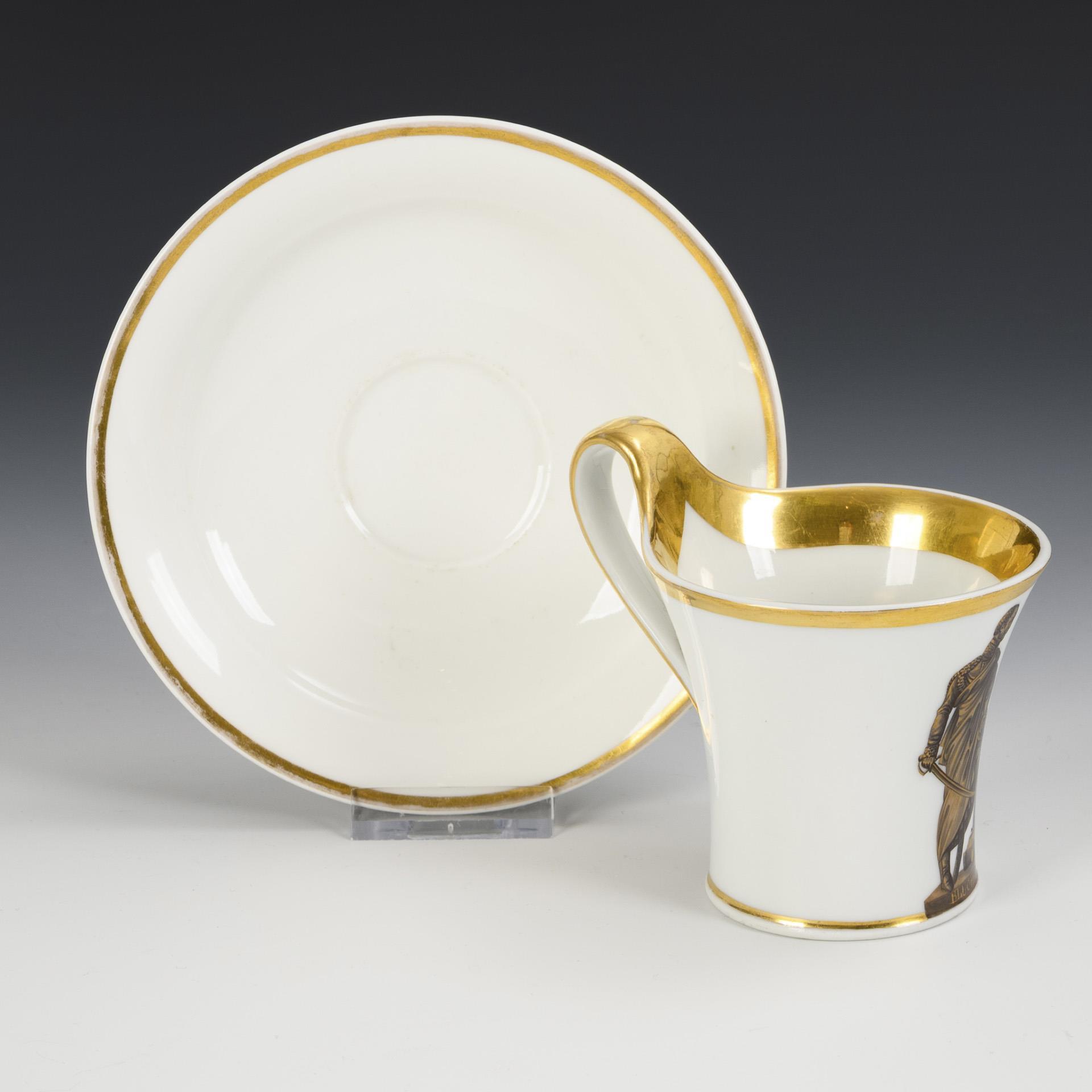 Sepia painting, gold decoration. Cup (h 9 cm), completed saucer (Ø 14 cm).