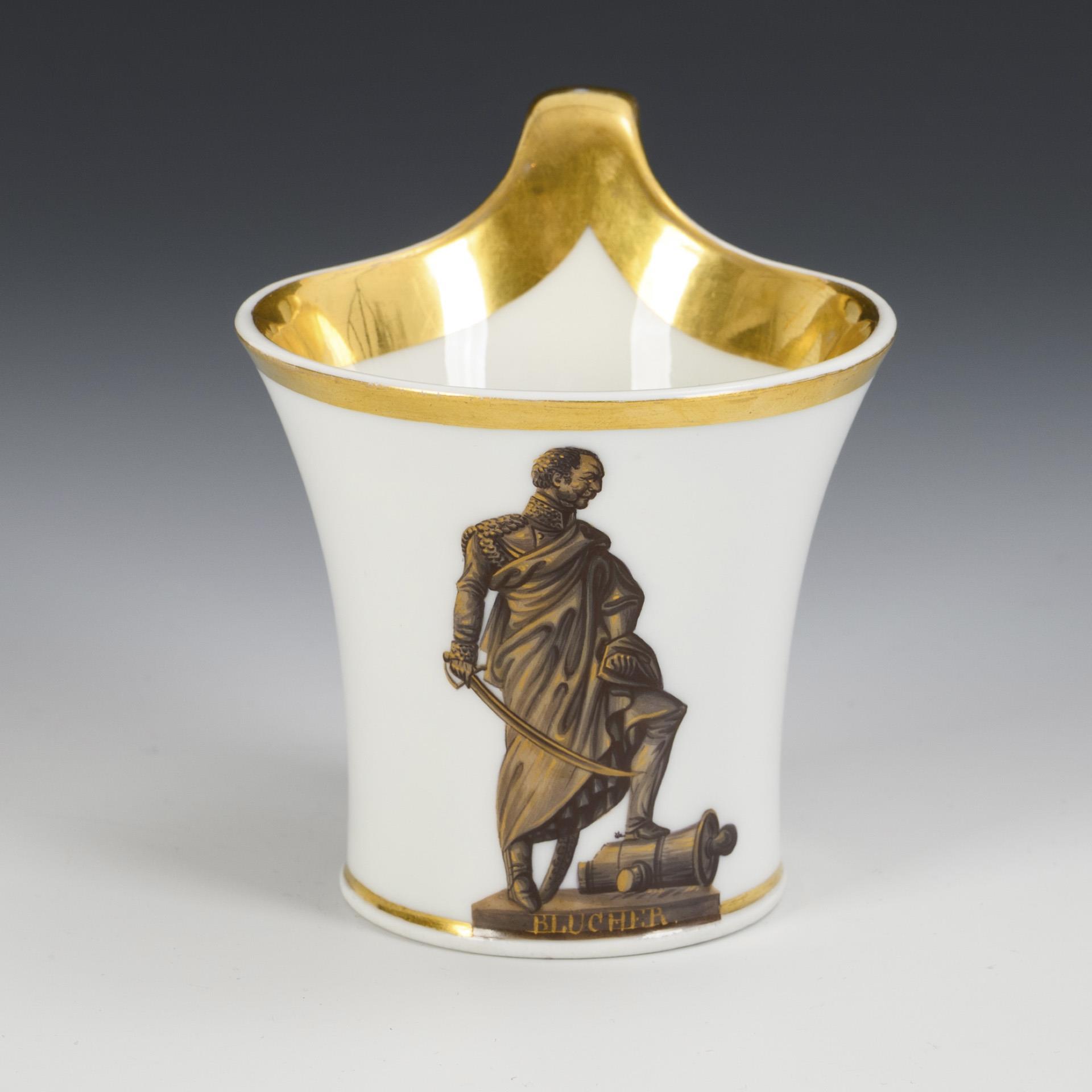 "Conical" model with campanile handle. On the front, the antique-style depiction of Prussian Field Marshal Gerhard Leberecht von Blücher with sword, one leg resting on a broken cannon.