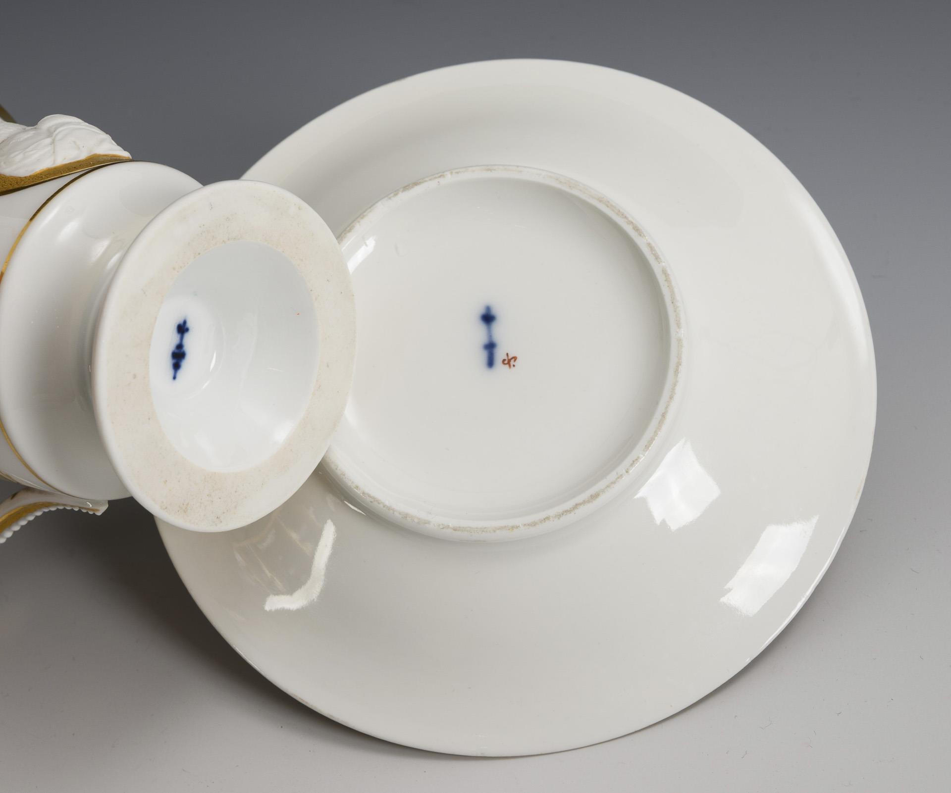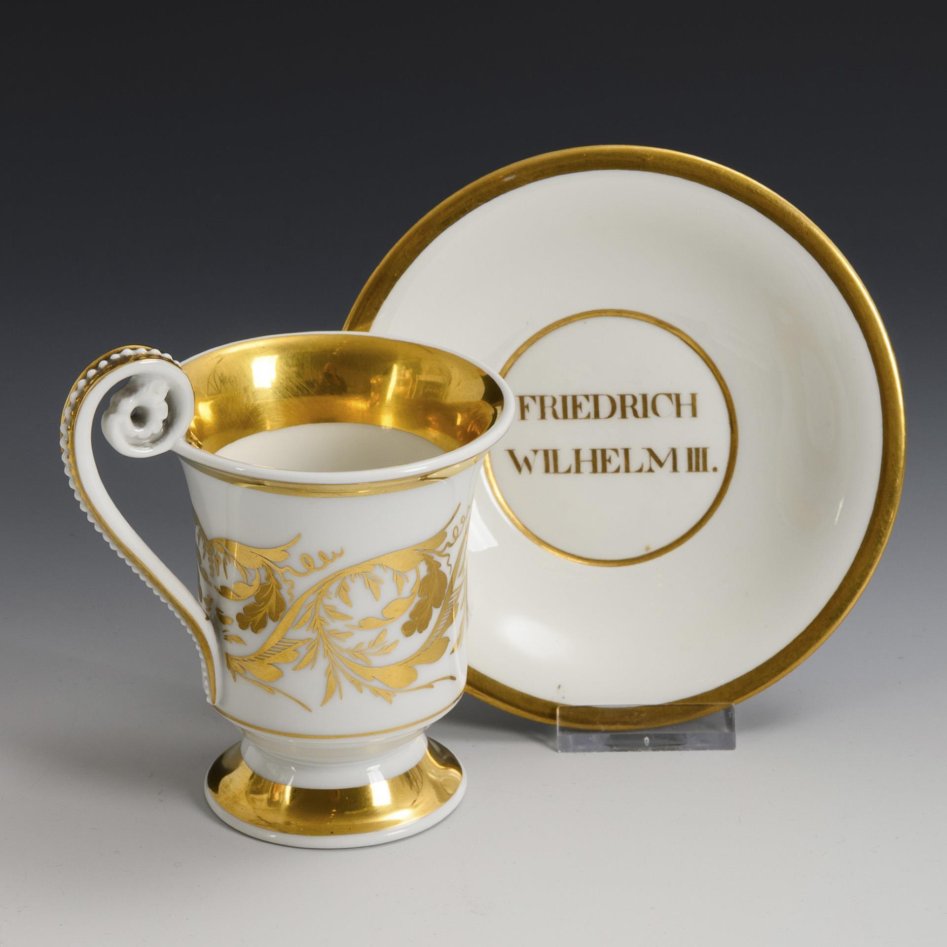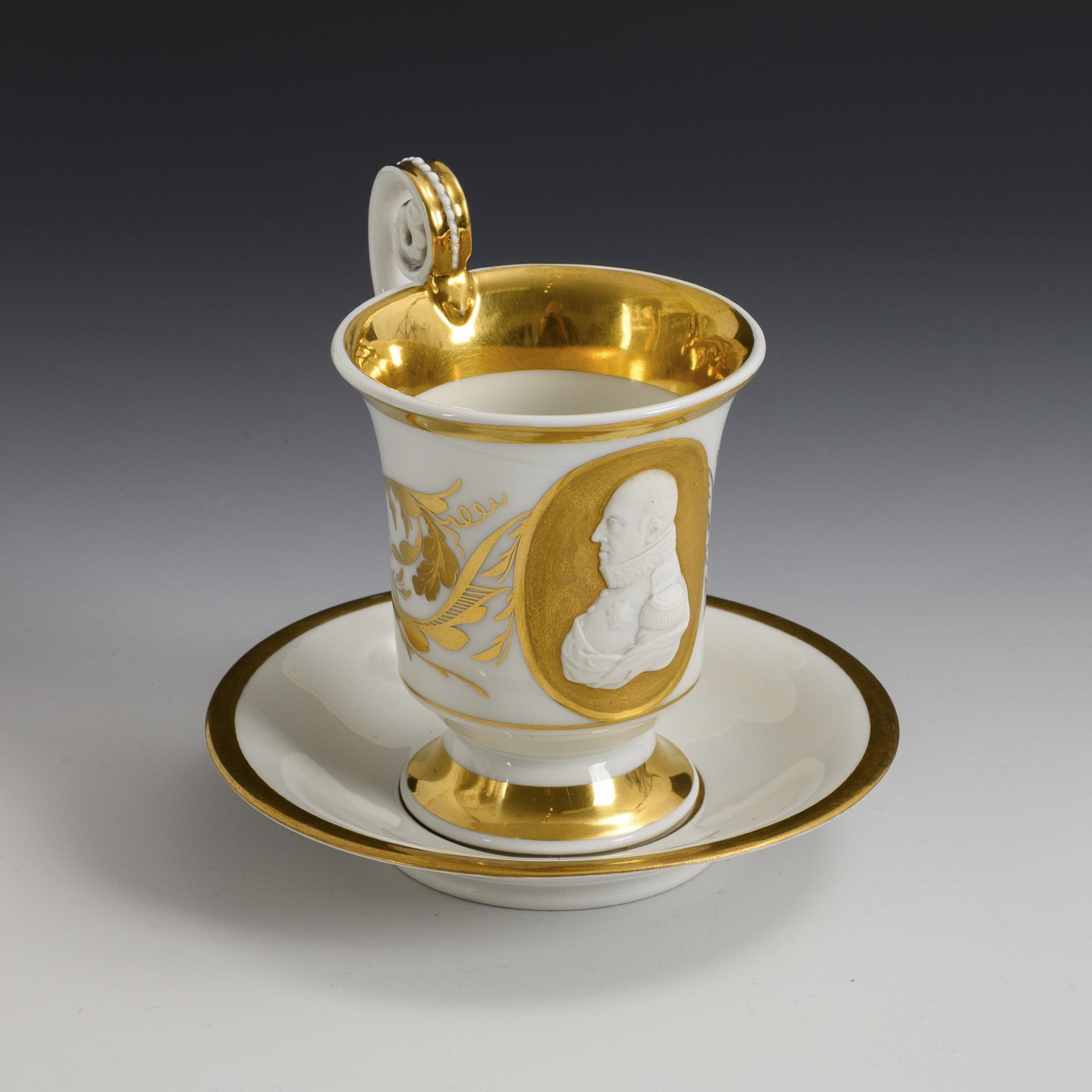 Footed bell-shaped cup with pearl band handle. An oval medallion on the front, the bisque portrait of King Frederick William III of Prussia (1770-1840) in front of a gold background engraved with a spiral band, verso painted in vegetal gold. In the mirror of the saucer the inscription "Friedrich Wilhelm III.".