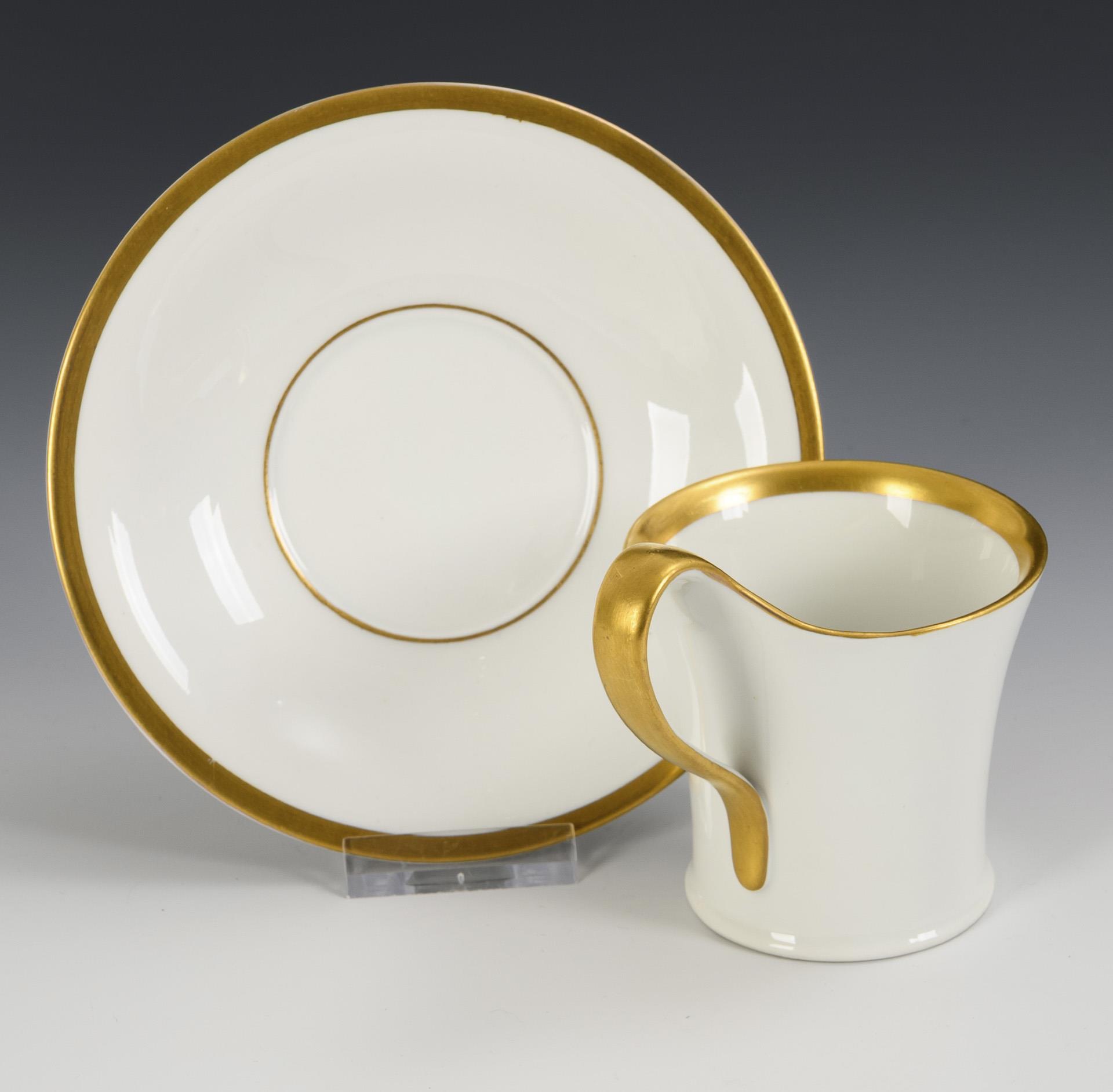 Polychrome painted, decorated in gold. Cup (h 9 cm), completed saucer (Ø 14 cm).