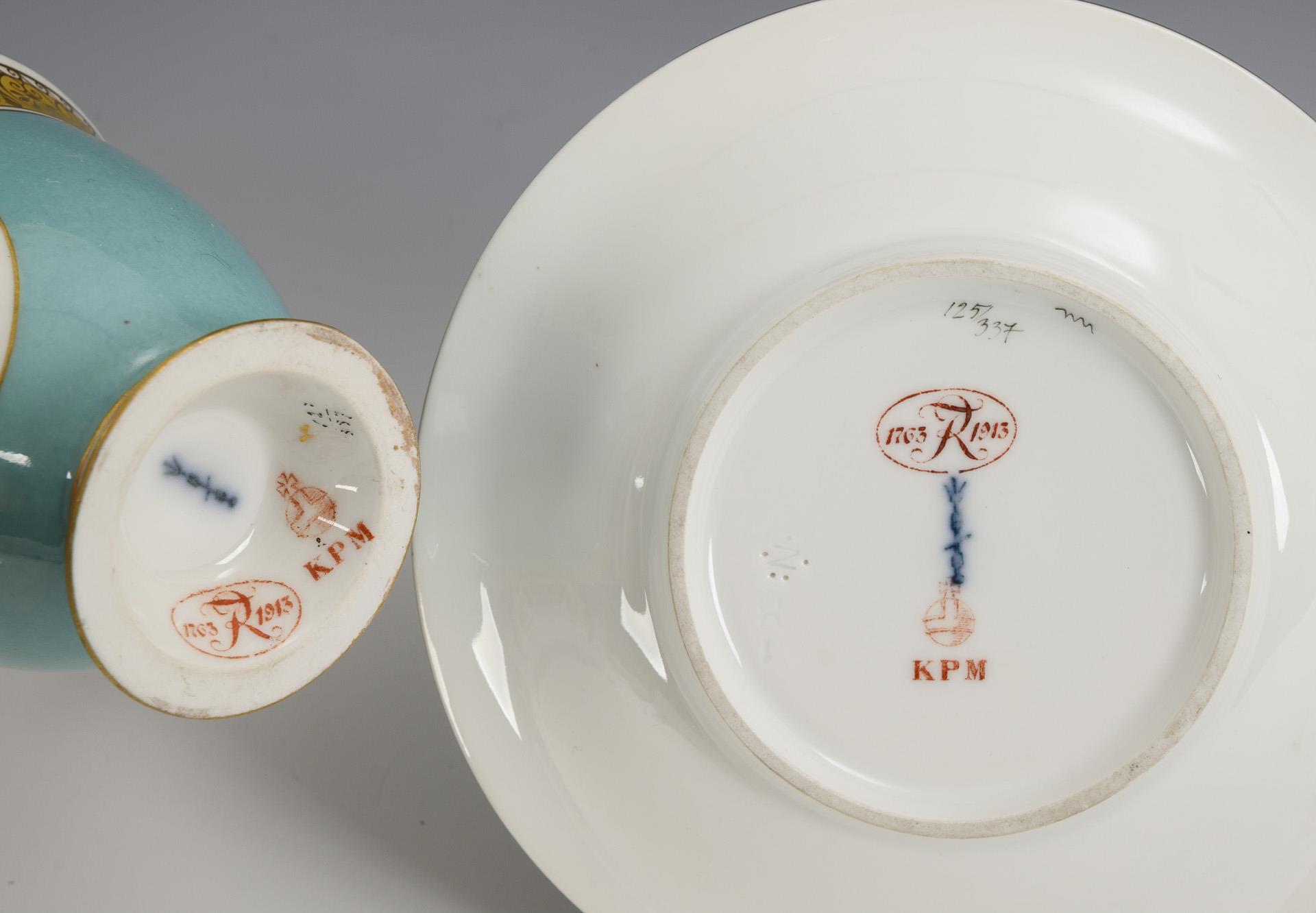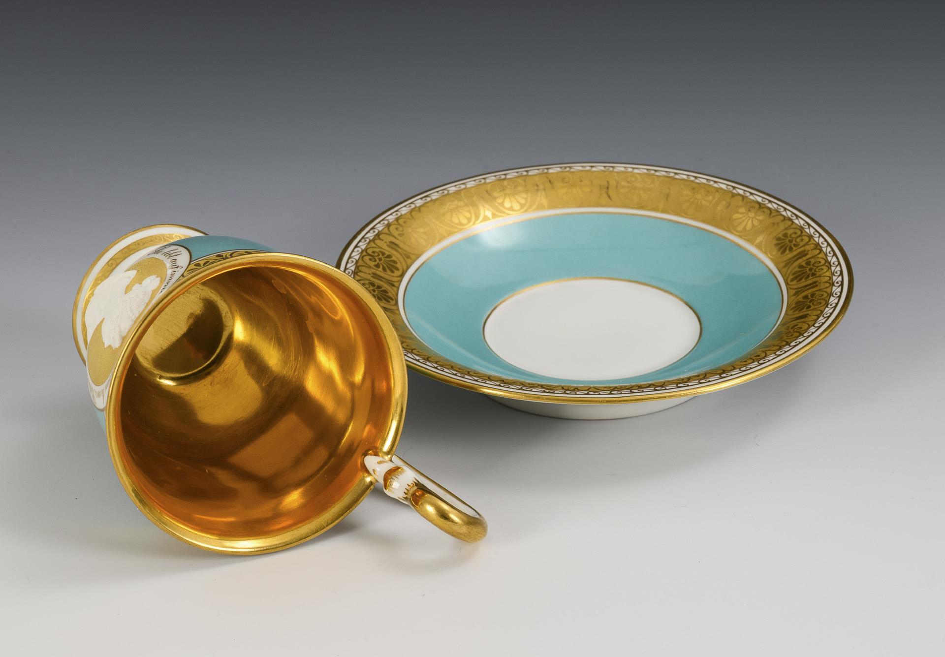 Footed bell-shaped cup with swan handle. Turquoise-colored background under a gold-engraved ornamental border, on the front an oval medallion with the bisque portrait of the Prussian Queen Luise (1776-1810), inscribed with the words "She lives forever in the hearts of loyal patriots.", gilded inside.