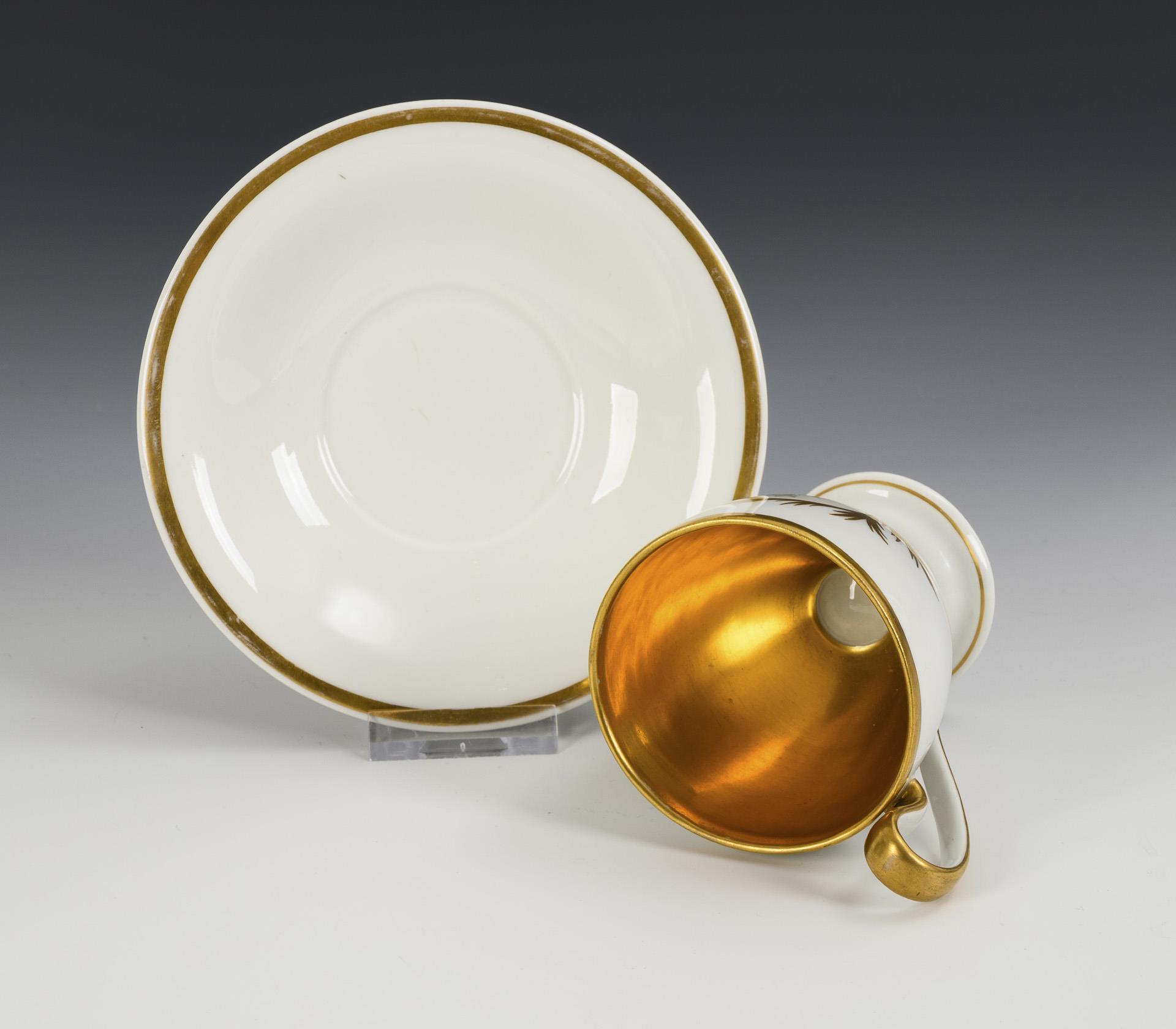 Polychrome painted, decorated in gold. Cup (h 9.5 cm), completed saucer (Ø 13.5 cm).