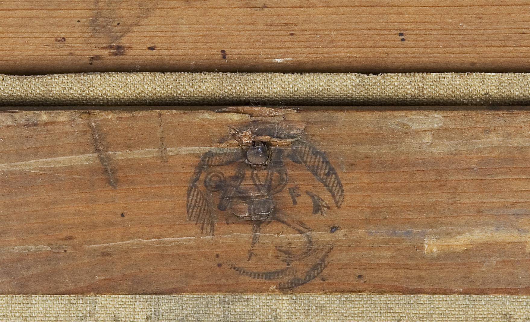Floral arrangement with grapes and peaches, generously painted in a well-balanced composition. The objects are convincingly depicted in space and light. Original stretcher with collection stamp, original gilded stucco frame. Frame slightly defective.