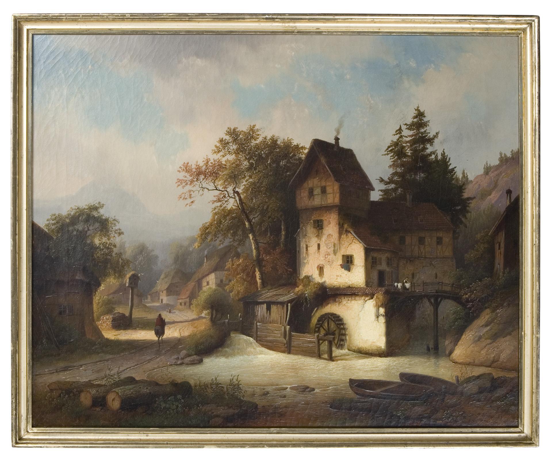 Poetically tuned landscape section with figural staffage. Original stretcher with old adhesive label and tax stamp, profiled wash gold frame.