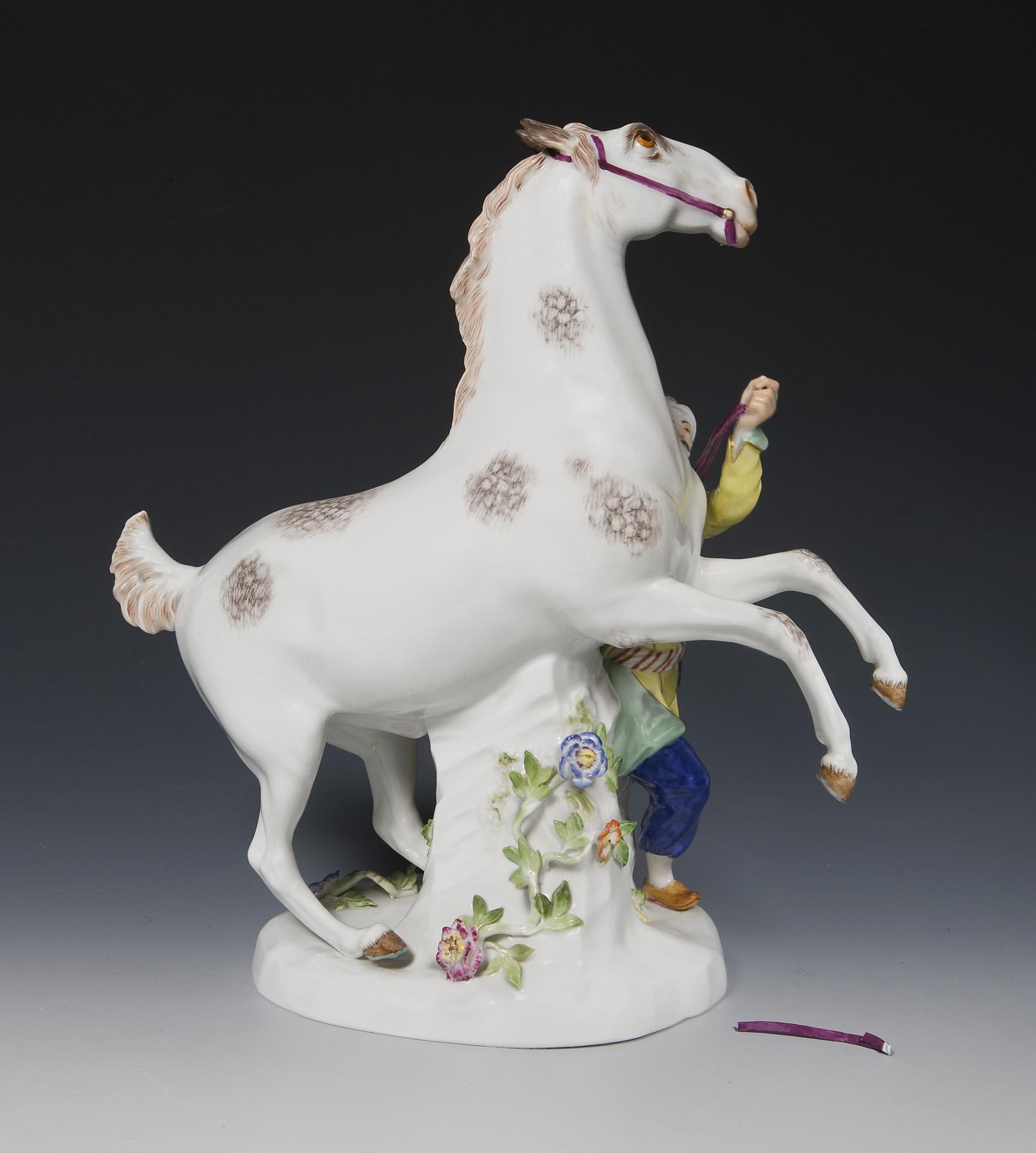 Counterpart to model no. A 51 x "African with horse". Painted in color, gold painted. Incised mark, impressed mark, painter's mark, sword mark painted twice. Reins, one baltt chipped, one original rein present, rein restored.