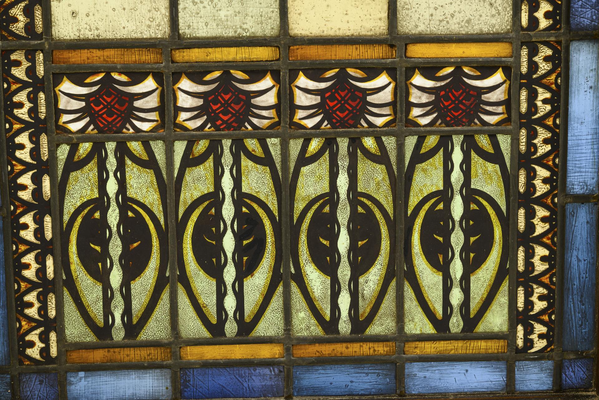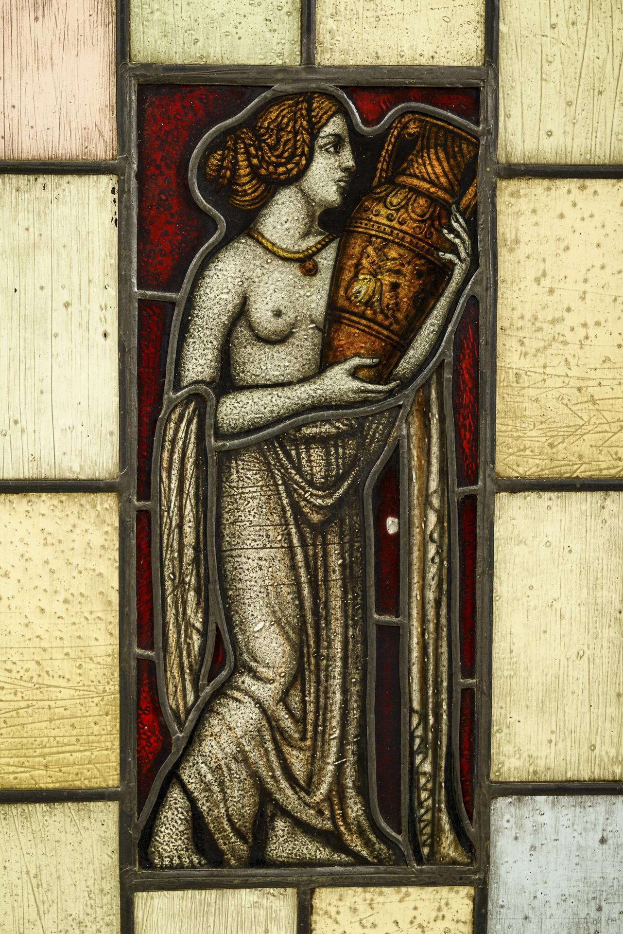 Large window with a central depiction of an antique-looking lady with a necklace, braided hairstyle and a flowing draped fabric robe covering her abdomen, holding an amphora in her hands. This surrounded by pastel-colored glass panes, the lower edge with a high, vegetal decorative border. Signs of wear commensurate with age, some restorations to the lead rods, a few with losses. One side border pane with break-out, fixed with adhesive tape.