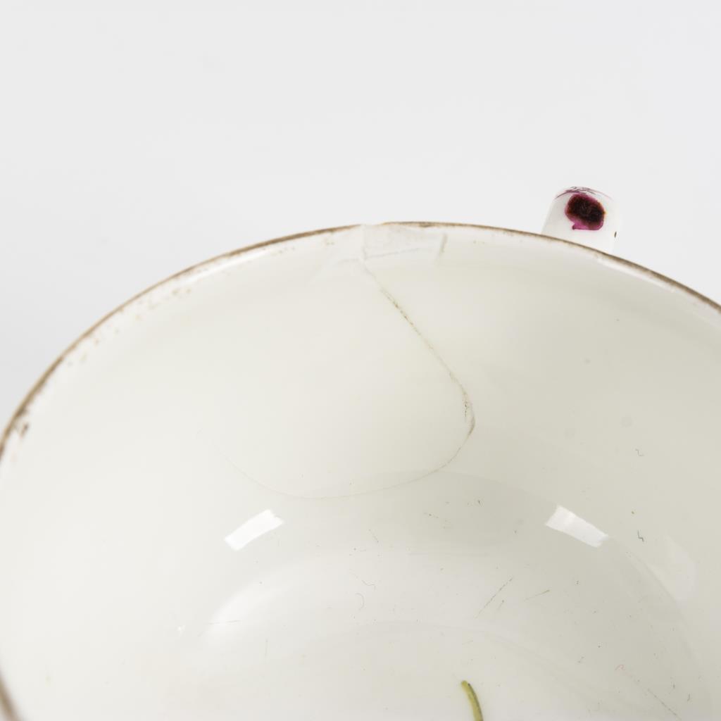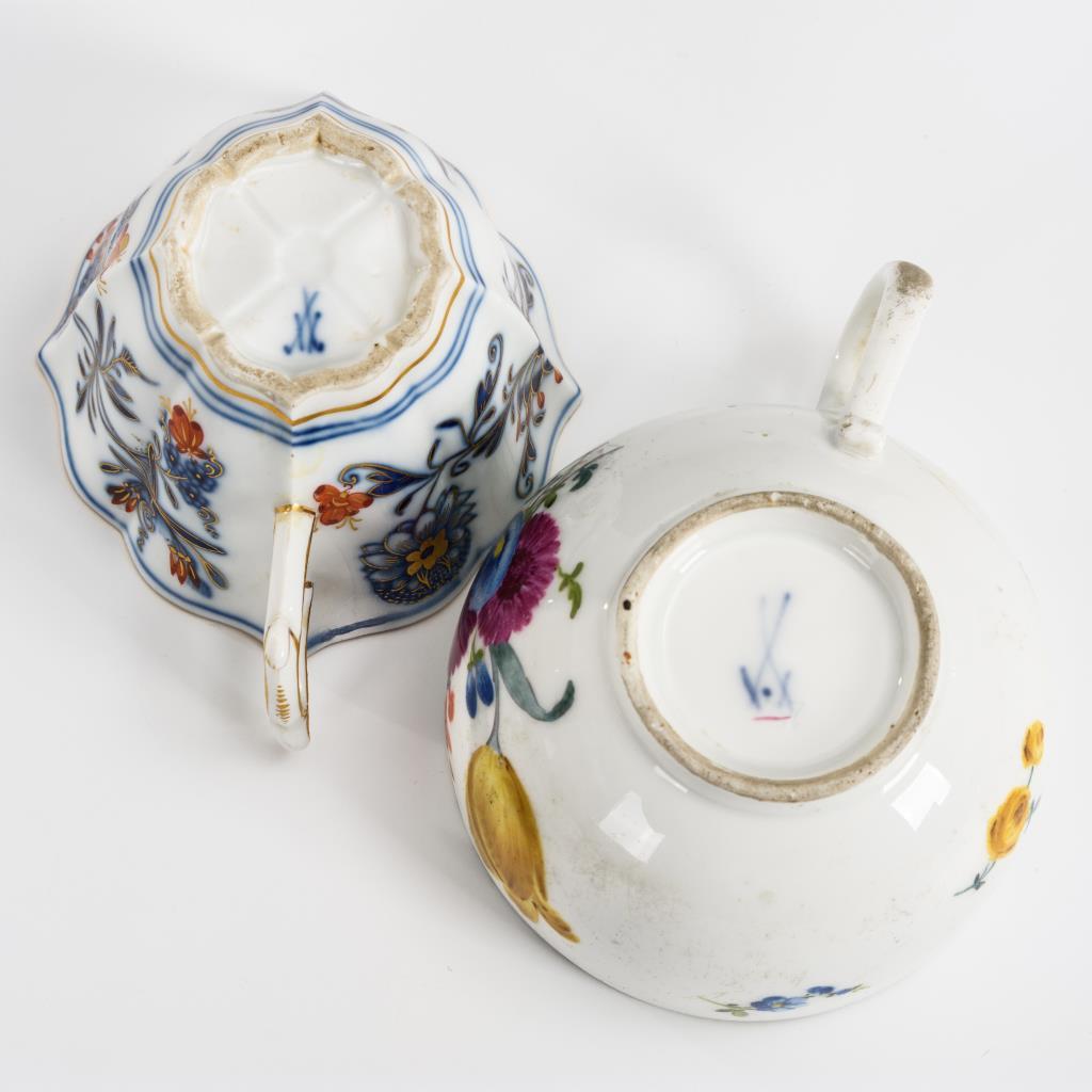 1x mit Blumenmalerei, 1x mit Blumenrelief, Mosaikkartuschen und Blumenmalerei, 1x mit Zwiebelmuster, 1x mit Fels- und Vogelmalererei. 1x mit Haarriss, 1 Tasse restauriert.