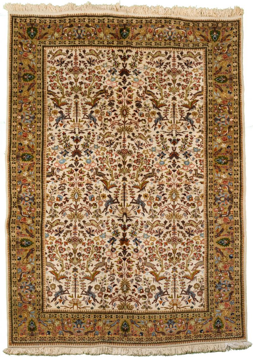 Wolle, handgeknüpft. Polychromdekor, vorwiegend Elfenbein und helles Braun.