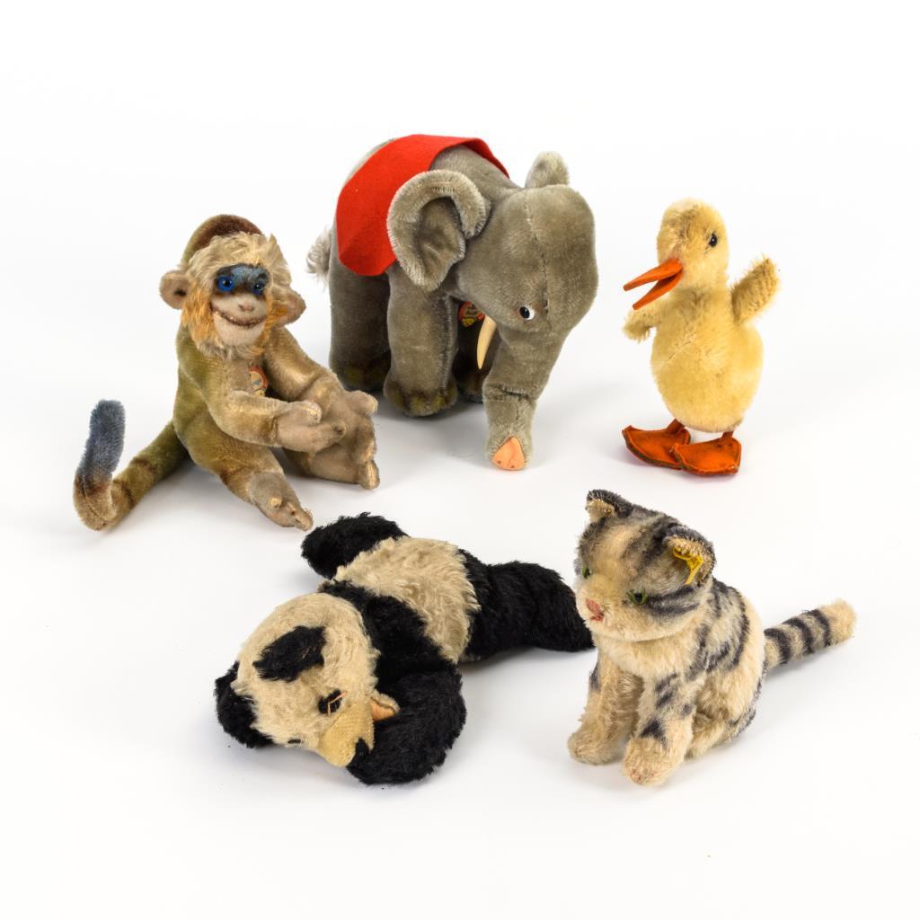 Elefant mit roter Satteldecke, junge Ente, Buntaffe "Mungo", Katze und liegender Panda. Unbespielt, mit minimalen Altersspuren.