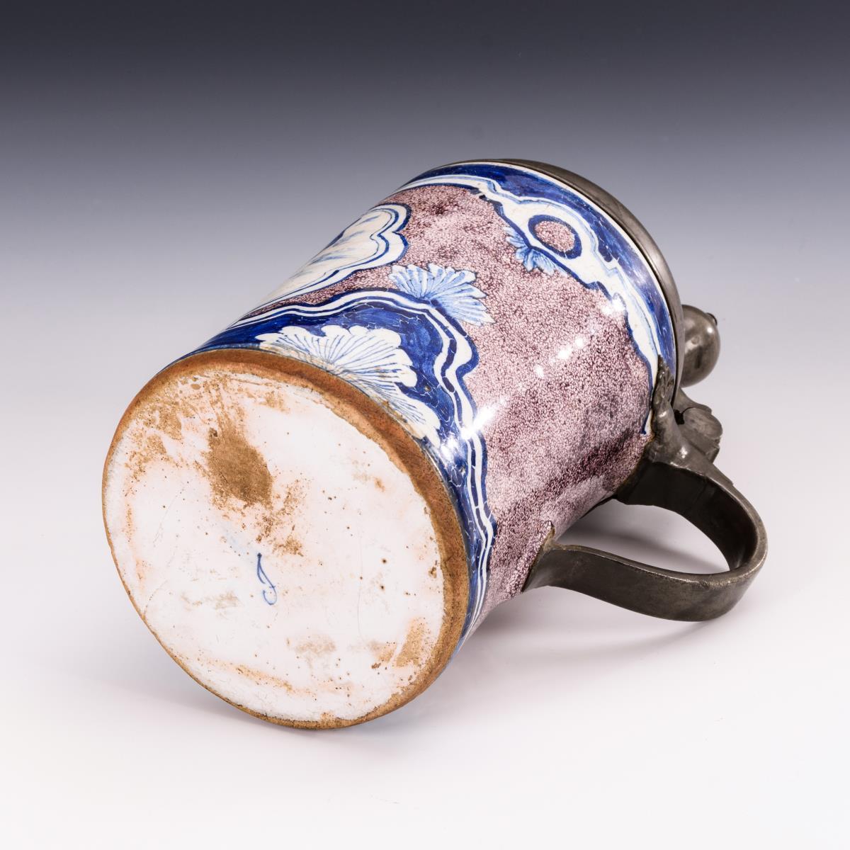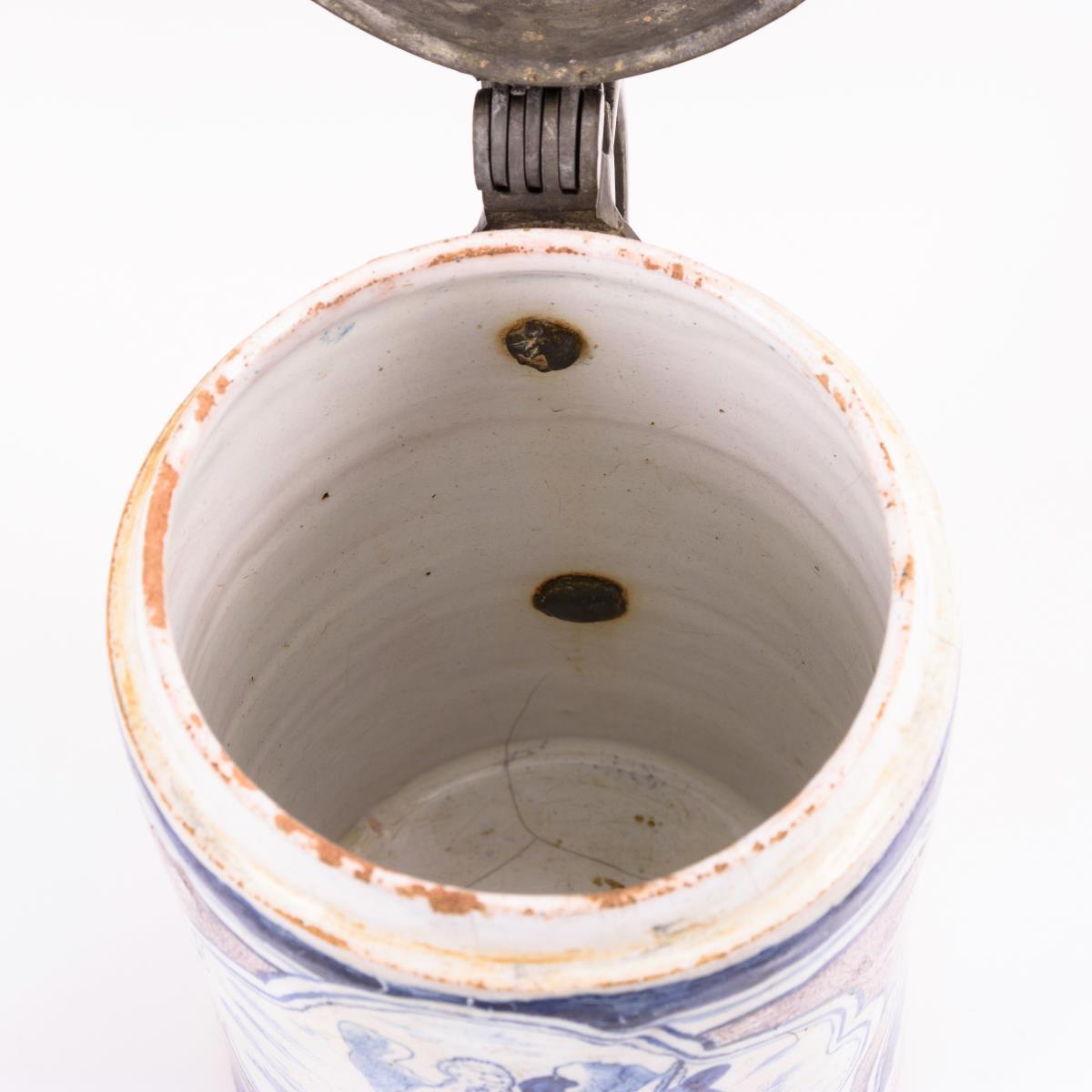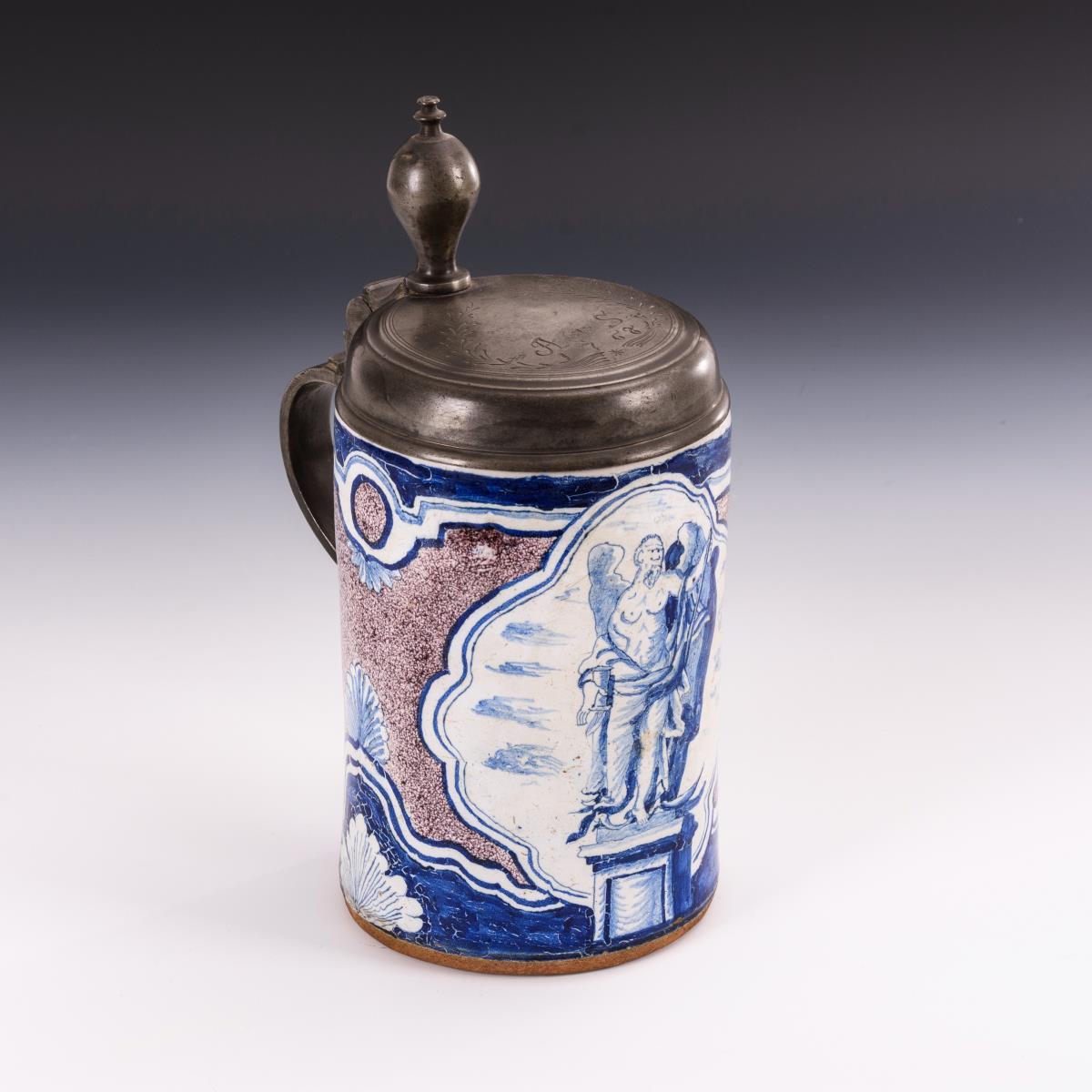 Berliner Fayence-Walzenkrug mit antikisierender Männerfigur.