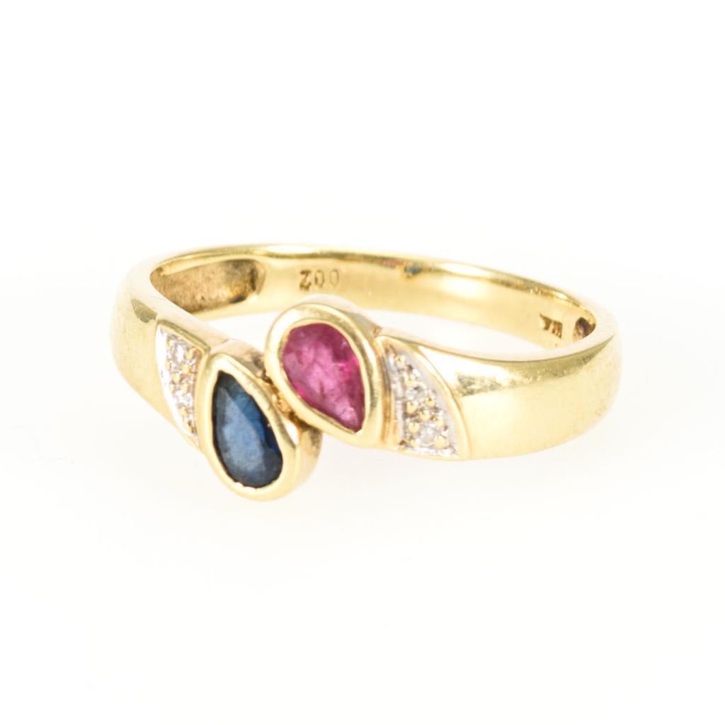 Rubin- und Saphirtropfen und 4 Kleinstdiamanten, in mittlerer Schiene.