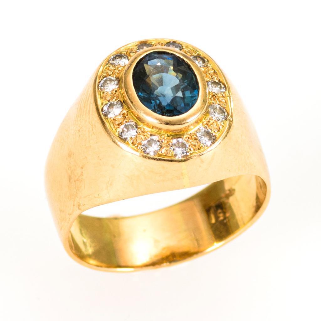 Breiter Ring mit Saphir, umringt von 12 kleinen, eingelassenen Brillanten.