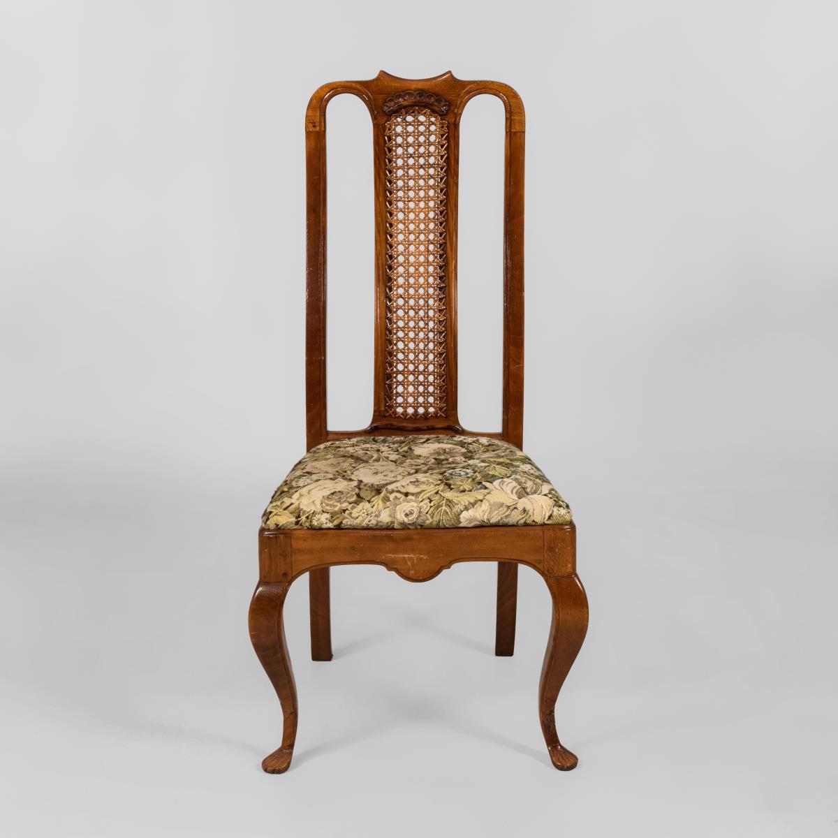 Lehnenbrett mit Geflecht, dezente Verzierung.