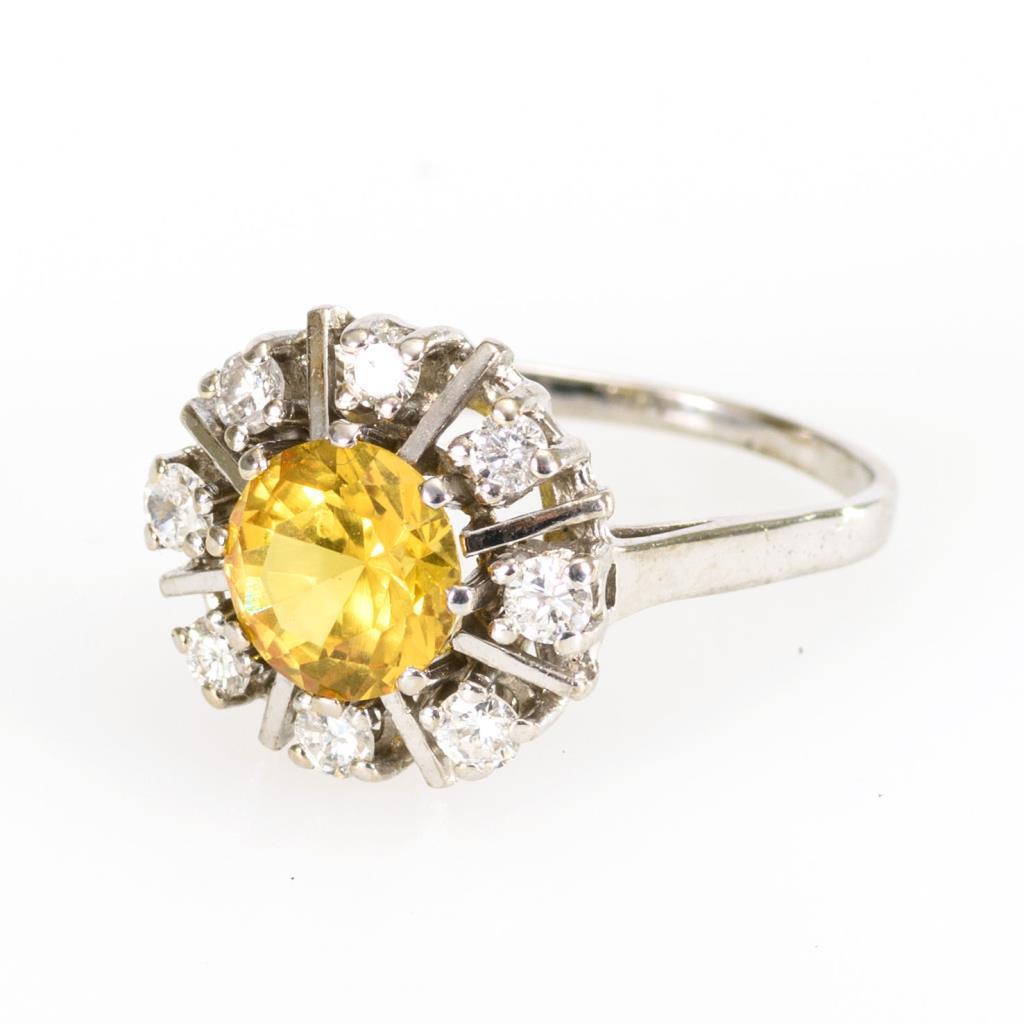 Sonnengelber Stein, umringt von 8 chatongefassten Brillanten. Schmale Schiene.