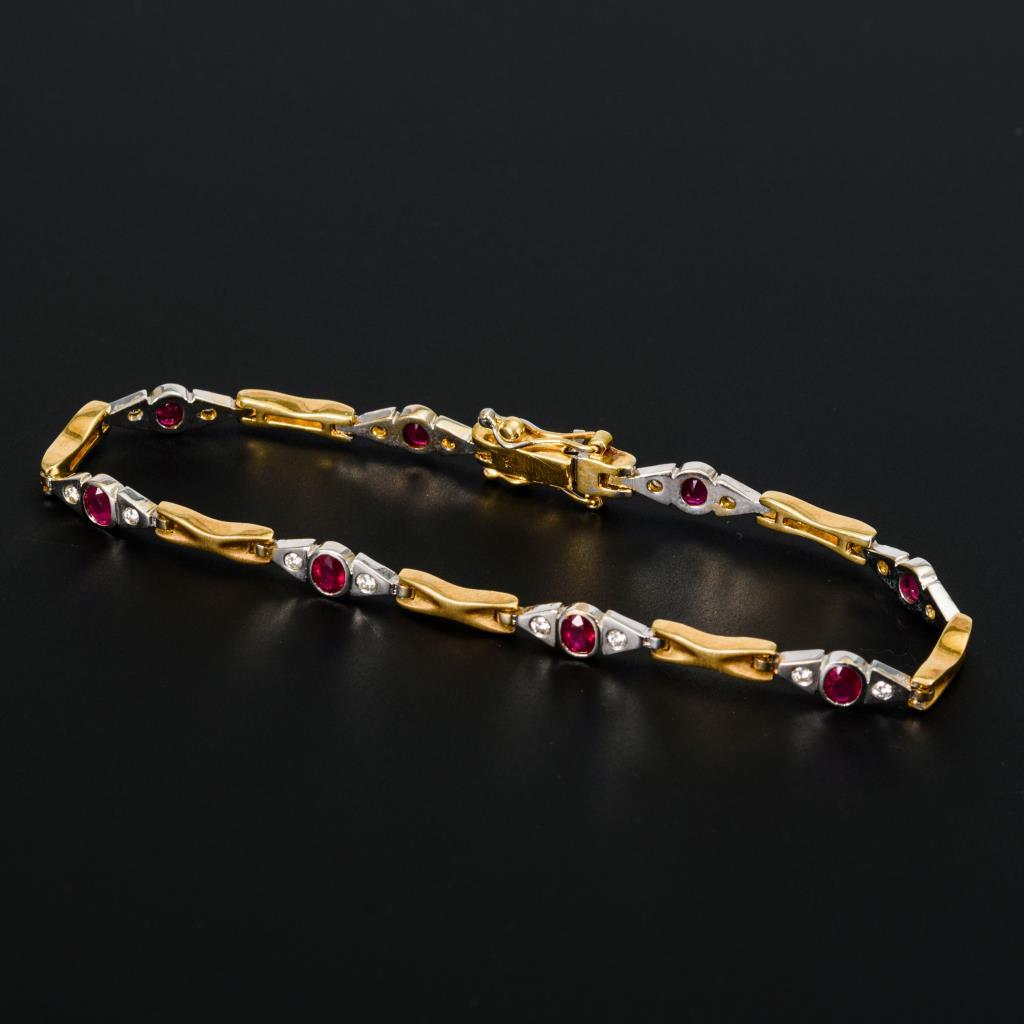 750 GG/WG geprüft, Punze undeutlich.18,5 x 0,5 cm, Brillanten zus. ca. 0,32 ct/H-I/vvs-vs, Rubine zus. ca. 1,44 ct.12,9 g.