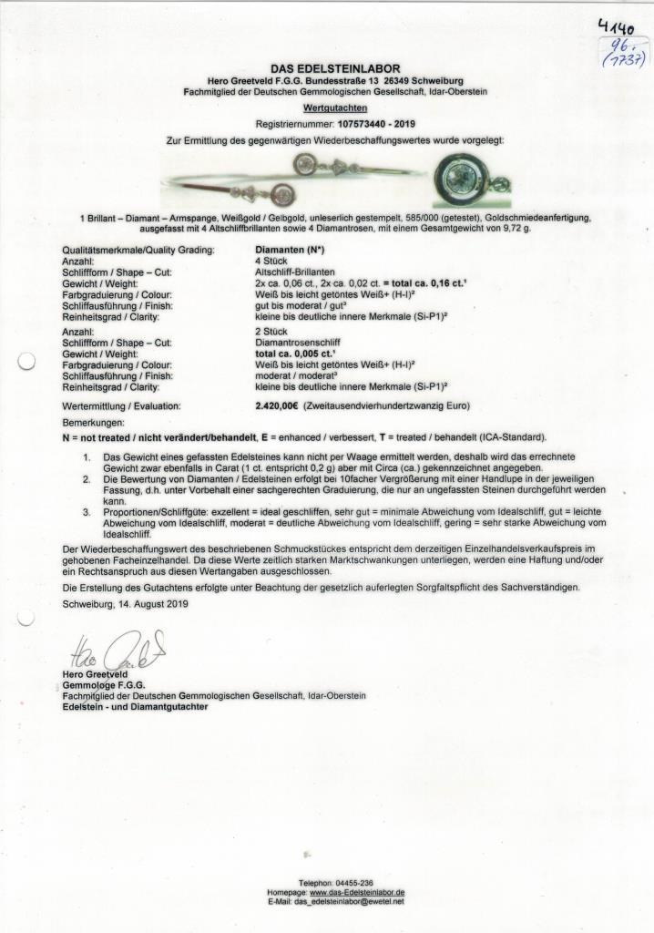 585 WG geprüft, Goldschmiedeanfertigung.Ø 6,2 cm, B 0,2 cm, Steine zus. ca. 0,165 ct/H-I/si-PI.9,7 g.