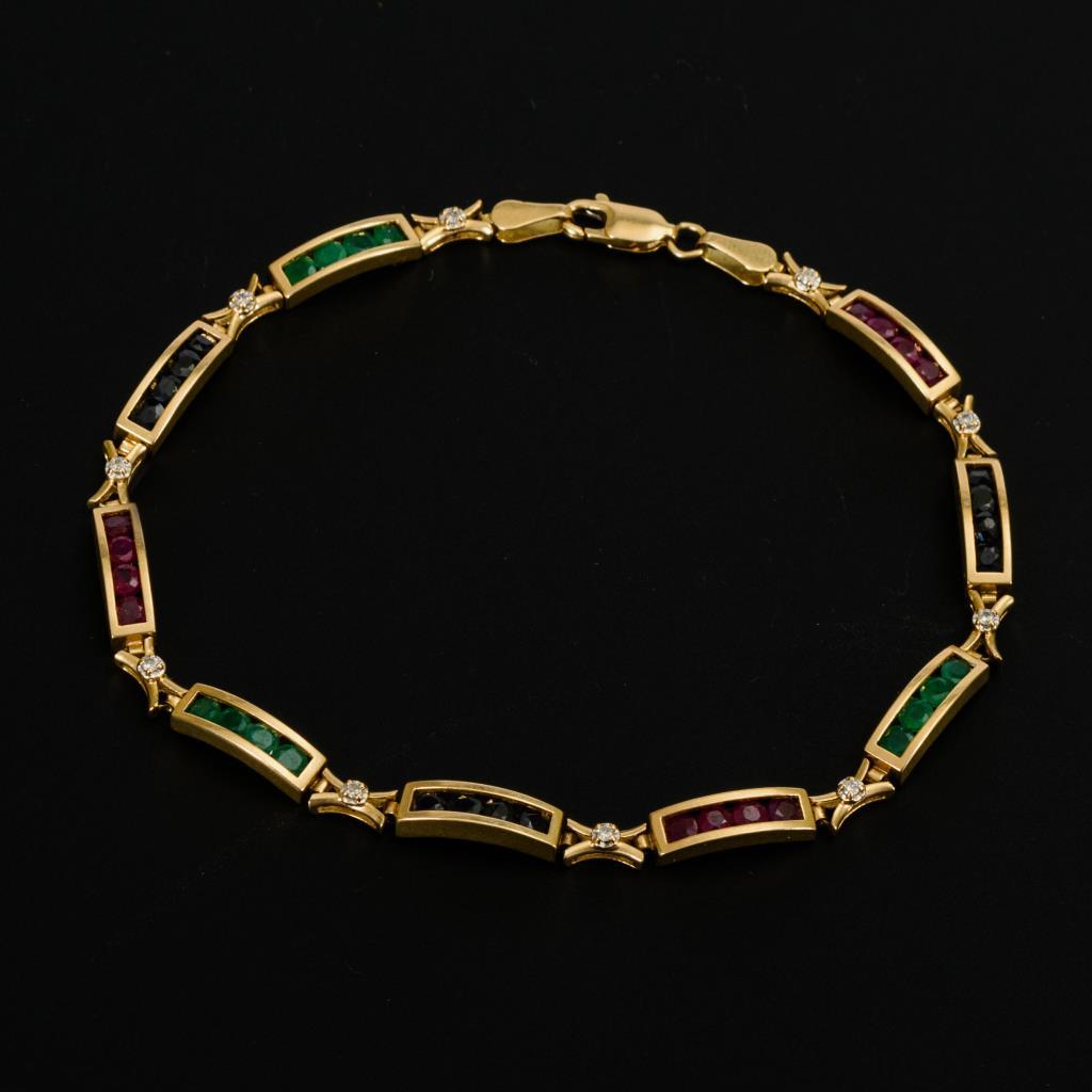Rahmenglieder mit insgesamt 12 Rubinen, Saphiren und Smaragden. Zwischenglieder mit je 1 Kleinstdiamant. Karabinerschloss .