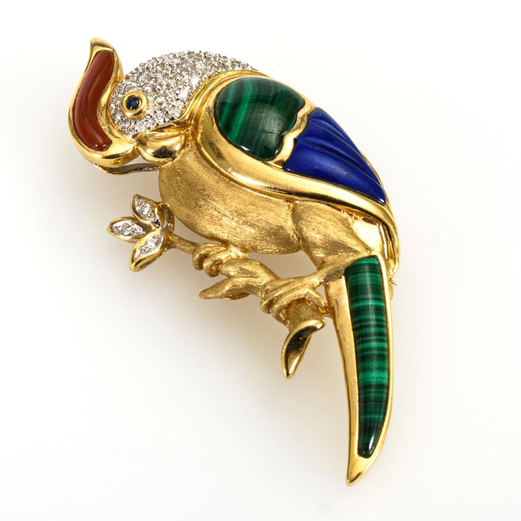 Halbplastischer Vogel, besetzt mit 40 Brillanten, 1 Saphir und Steinsegmenten Karneol, Malachit und Lapis. Kugelhaken .