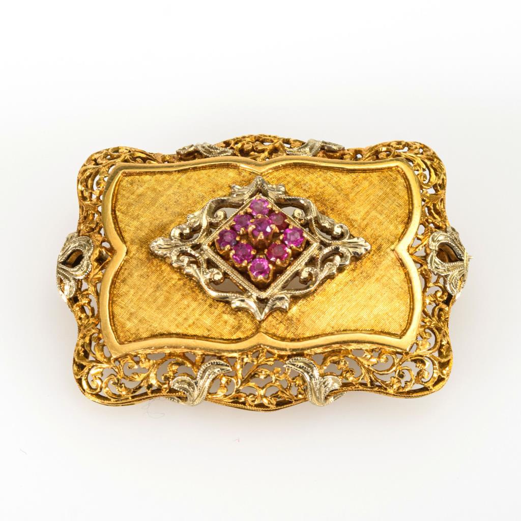Ornamentbrosche mit 9 kleinen Rubinen, netzgravierter Mitte und A-jour-Rankendekor. Kugelhaken.