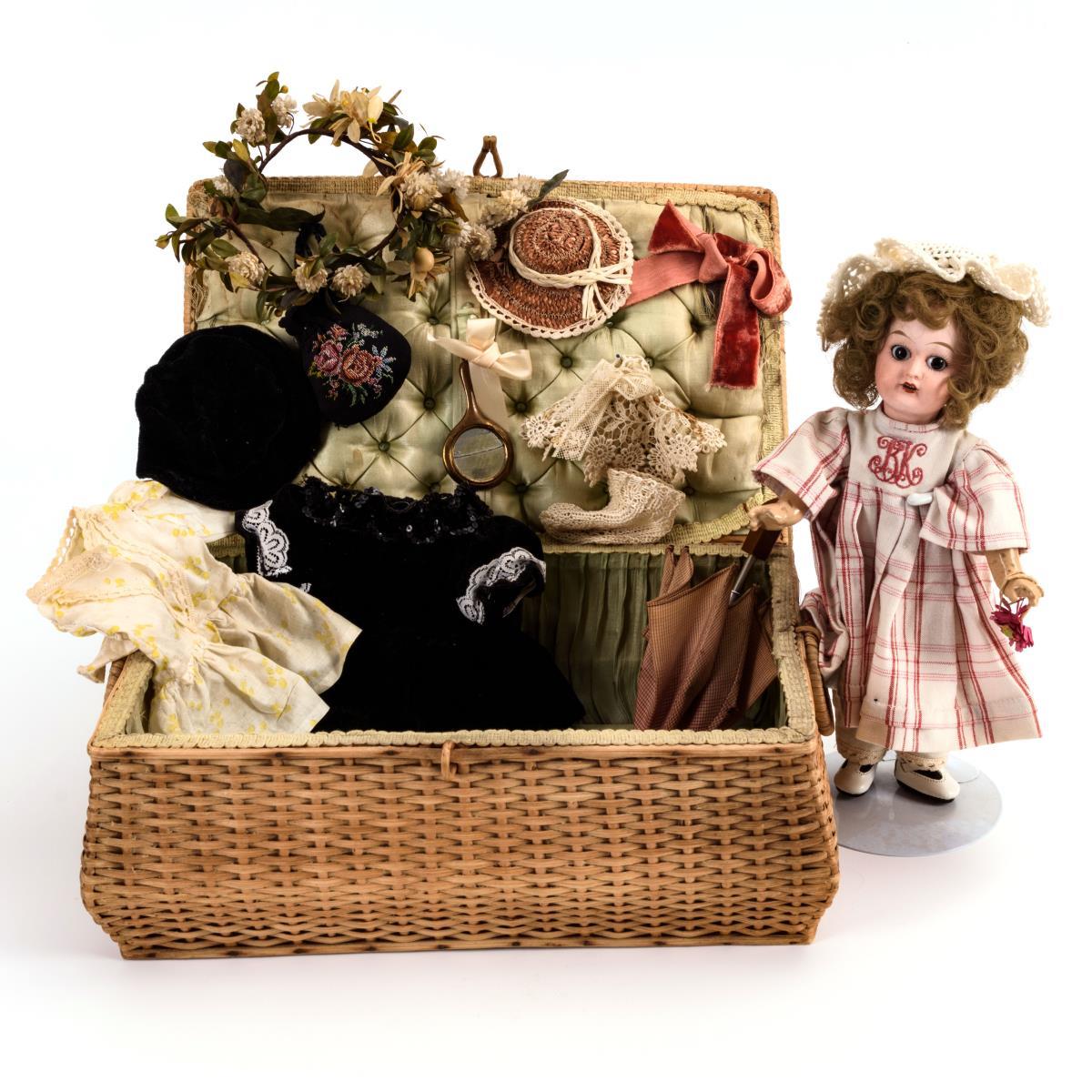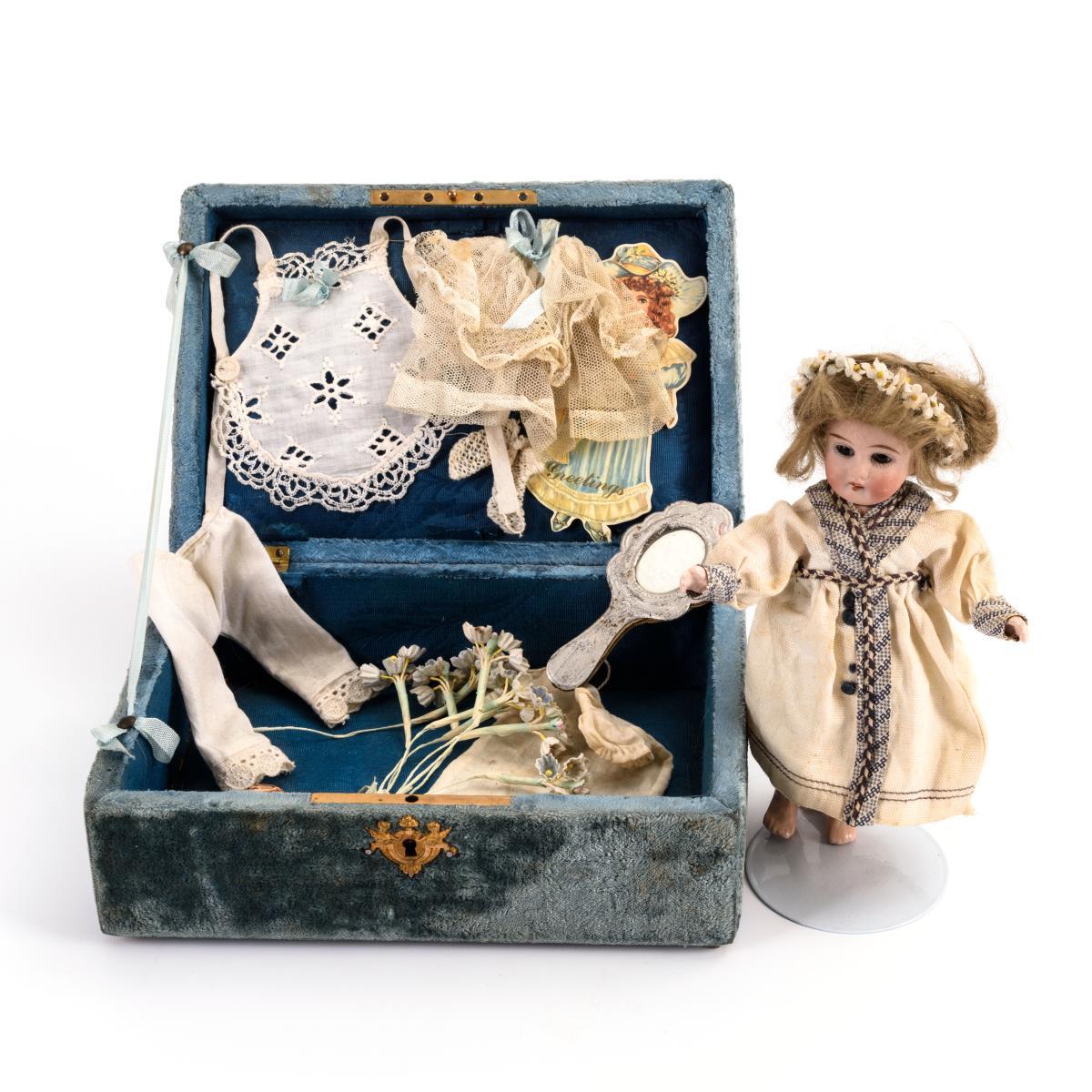 2 Puppen in Körbchen und Samtschatulle mit Zubehör.