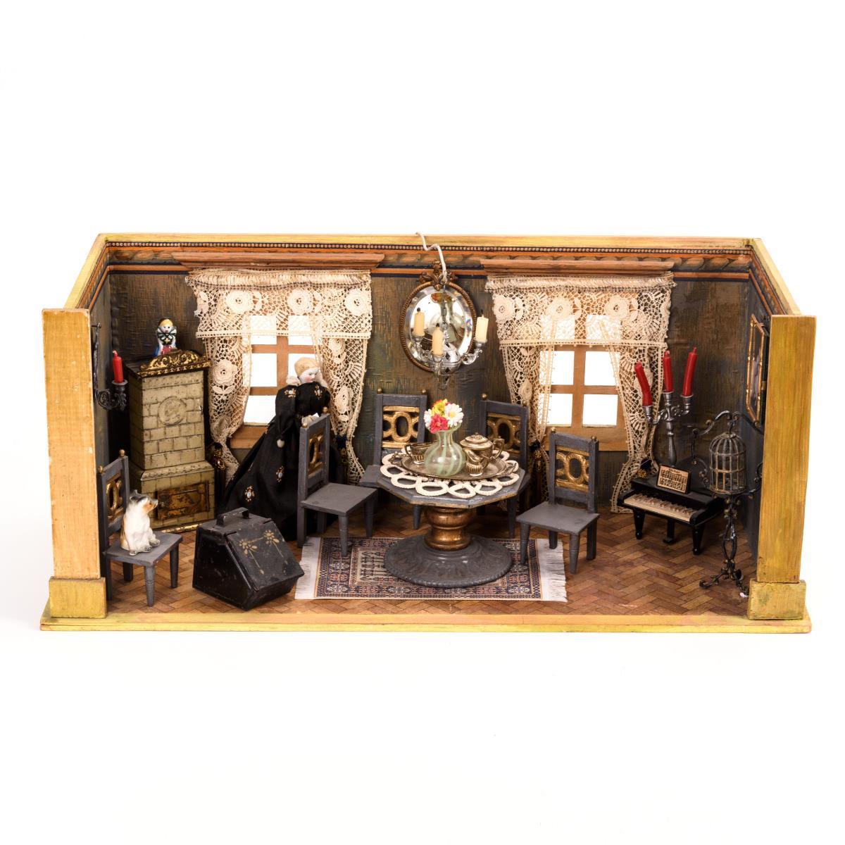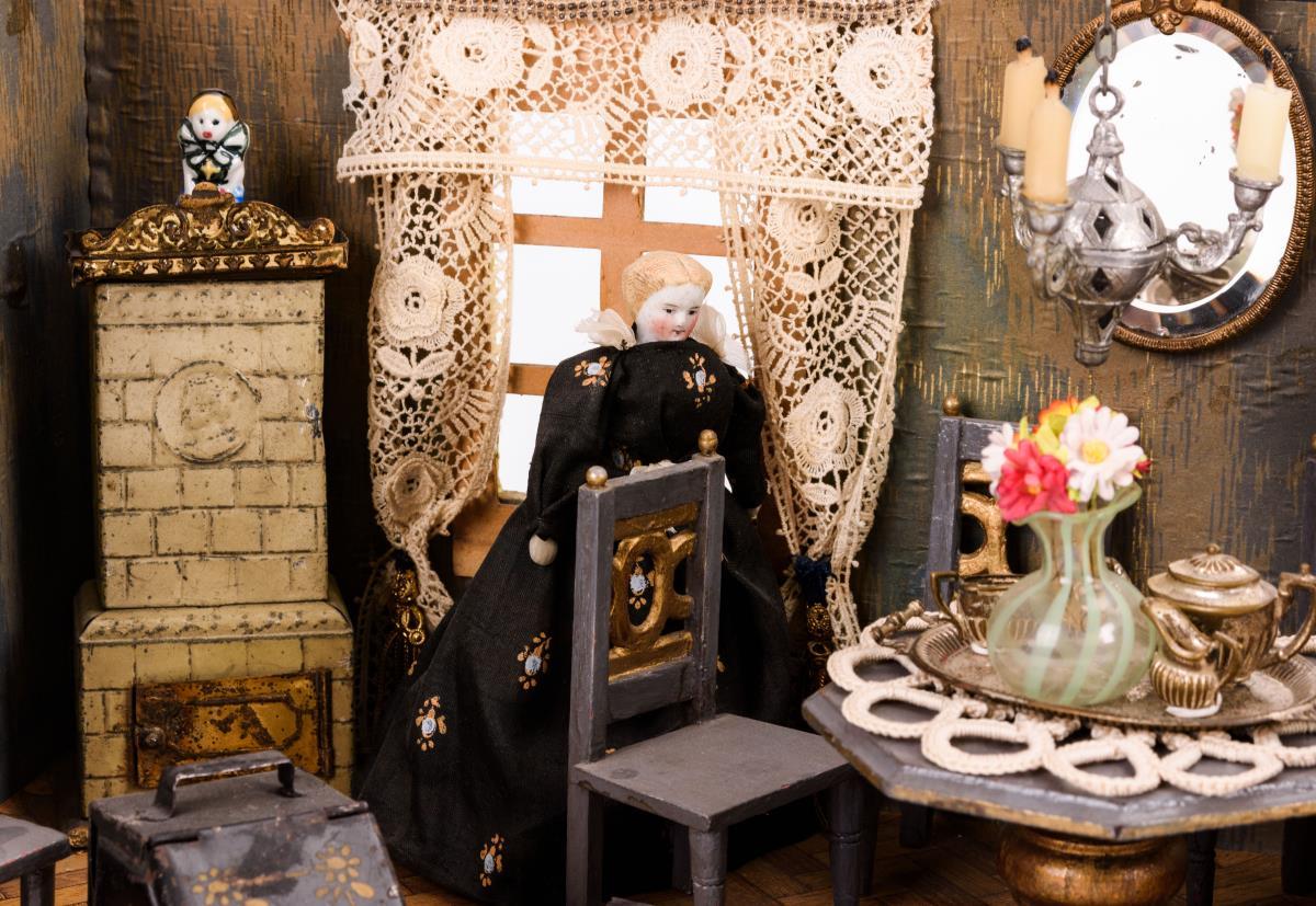 Kleine Puppenstube mit Blechofen.