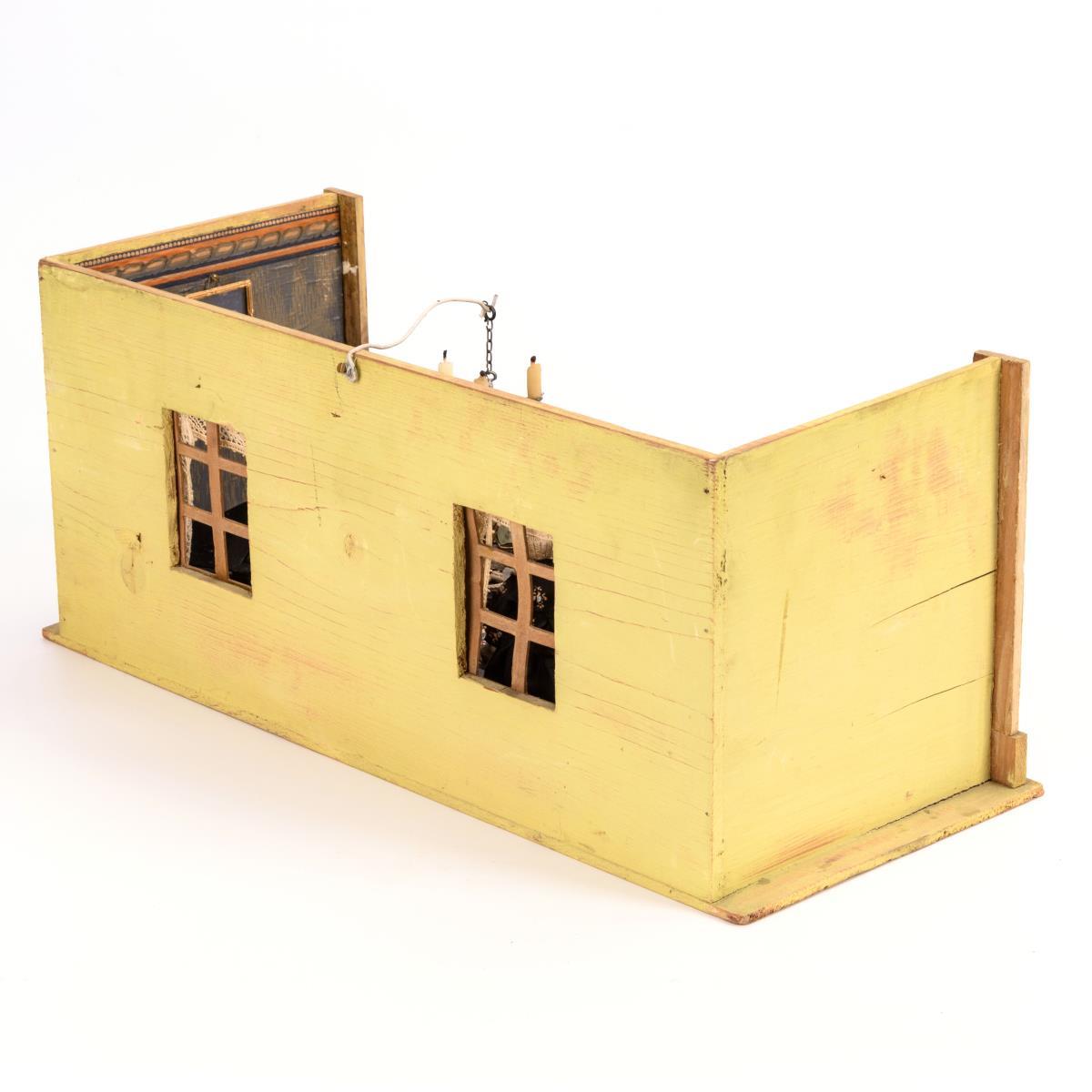 Holz, außen hellgrün gestrichen, Wände nachtapeziert, Boden mit Papier in Parkettoptik beklebt.