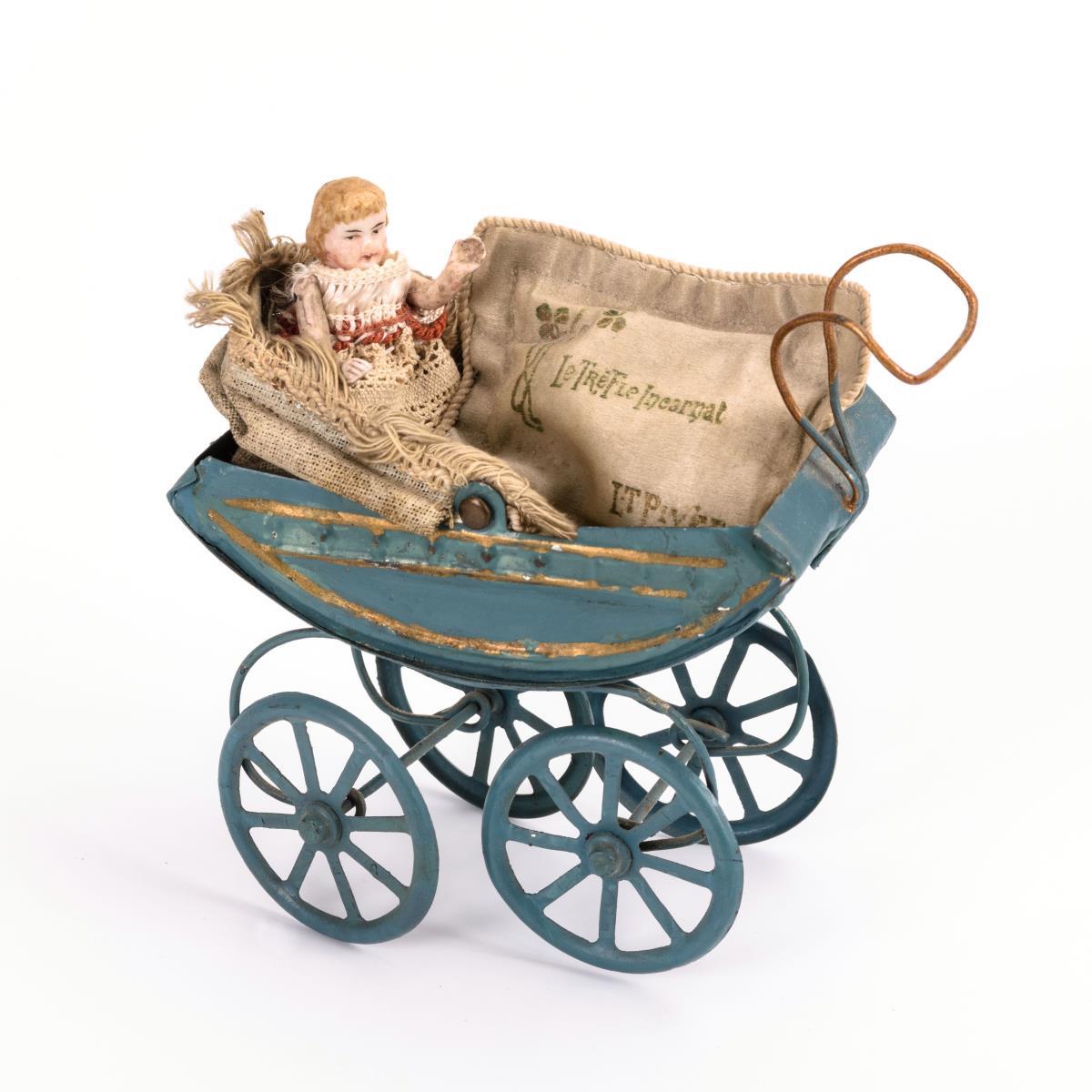 Puppenstubenpuppe mit Blech-Kinderwagen.