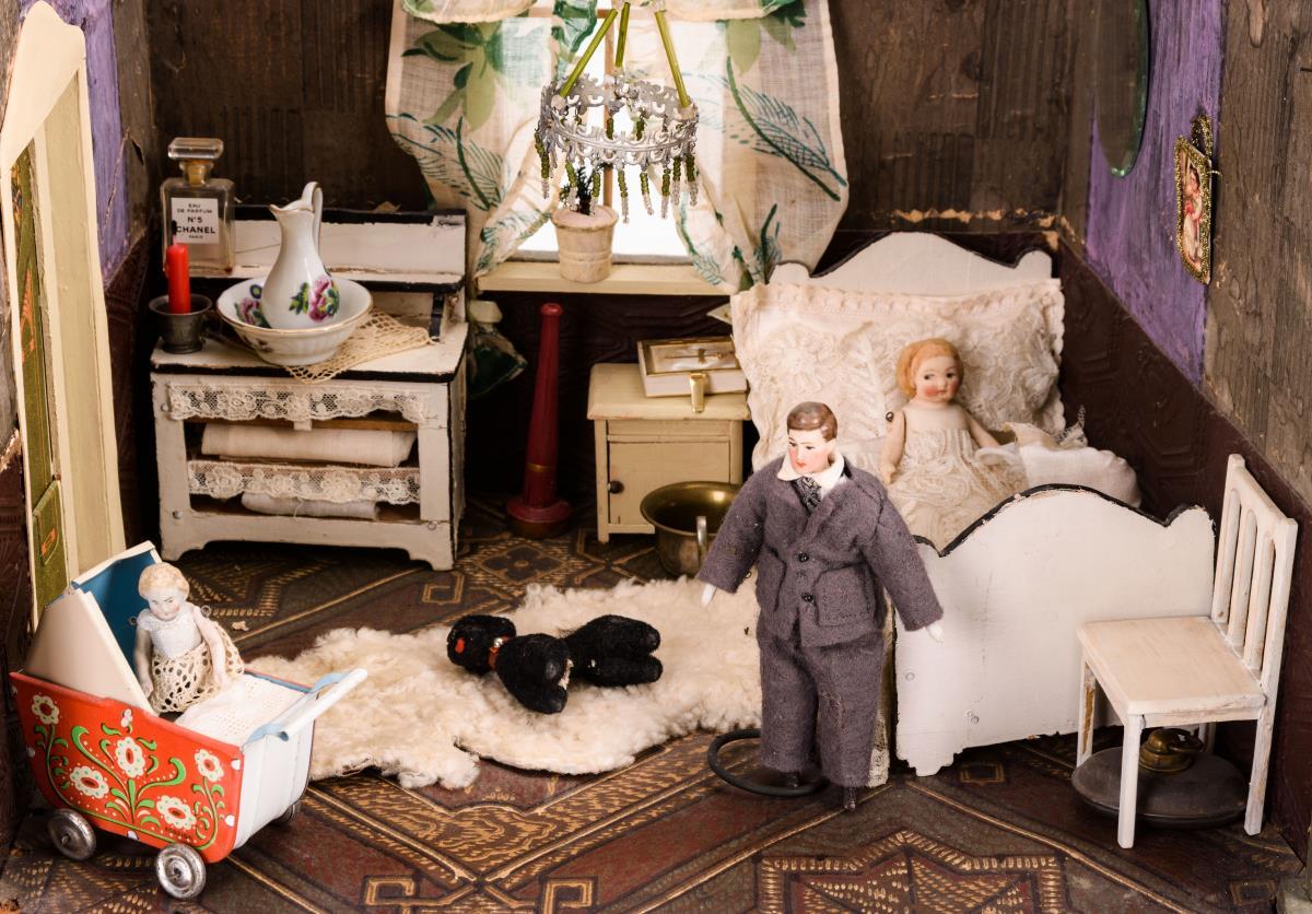 2-Raum-Puppenstube mit schönem Zubehör.