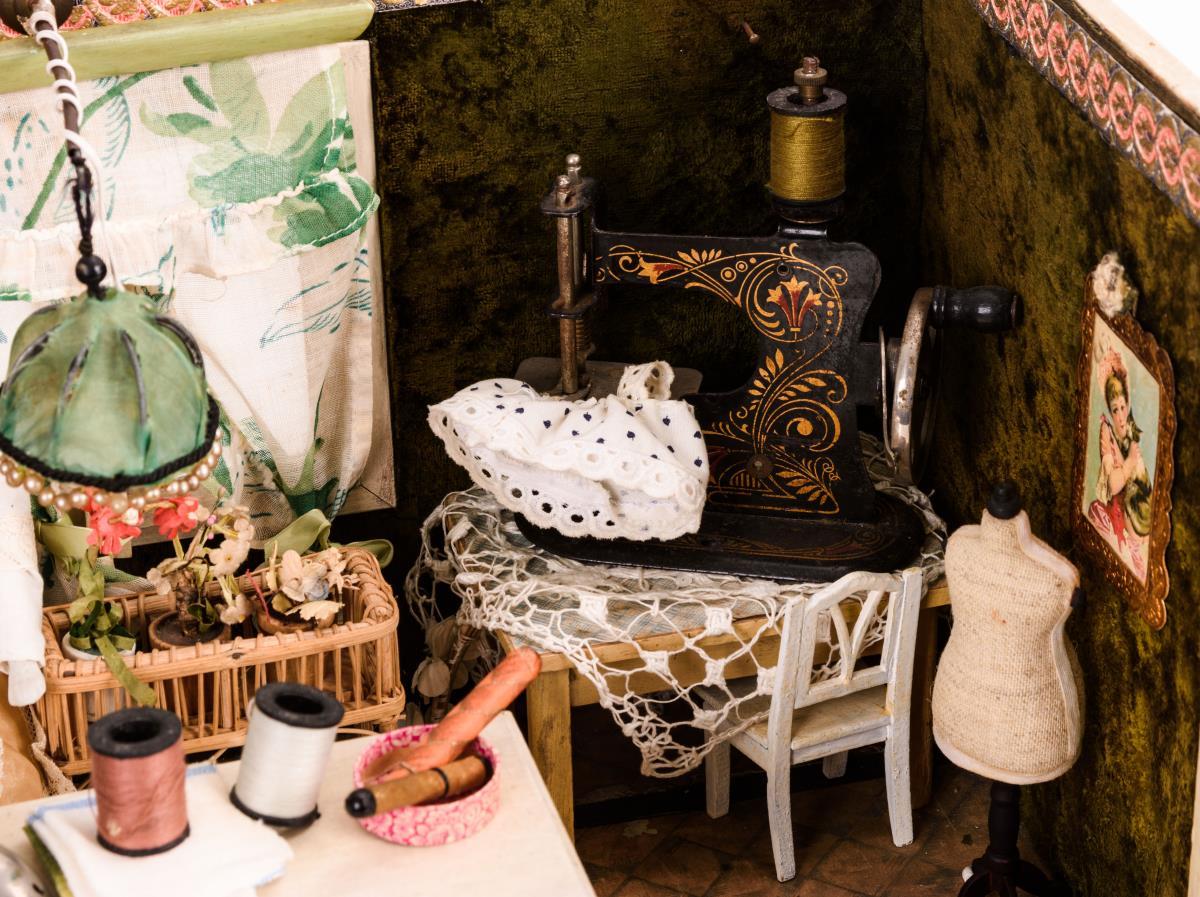 Holz, weiß lackiert, Wände mit grüner Stoffbespannung.