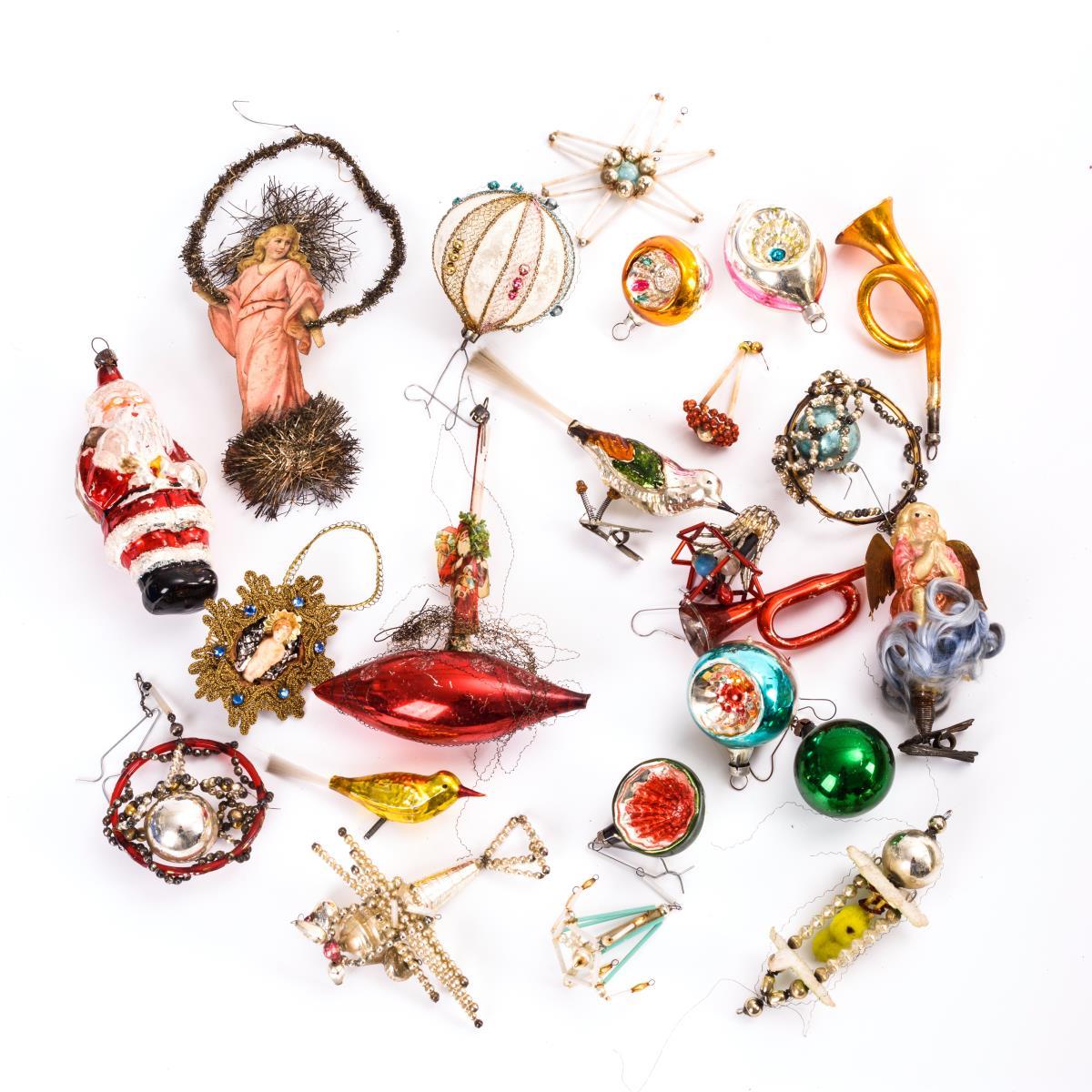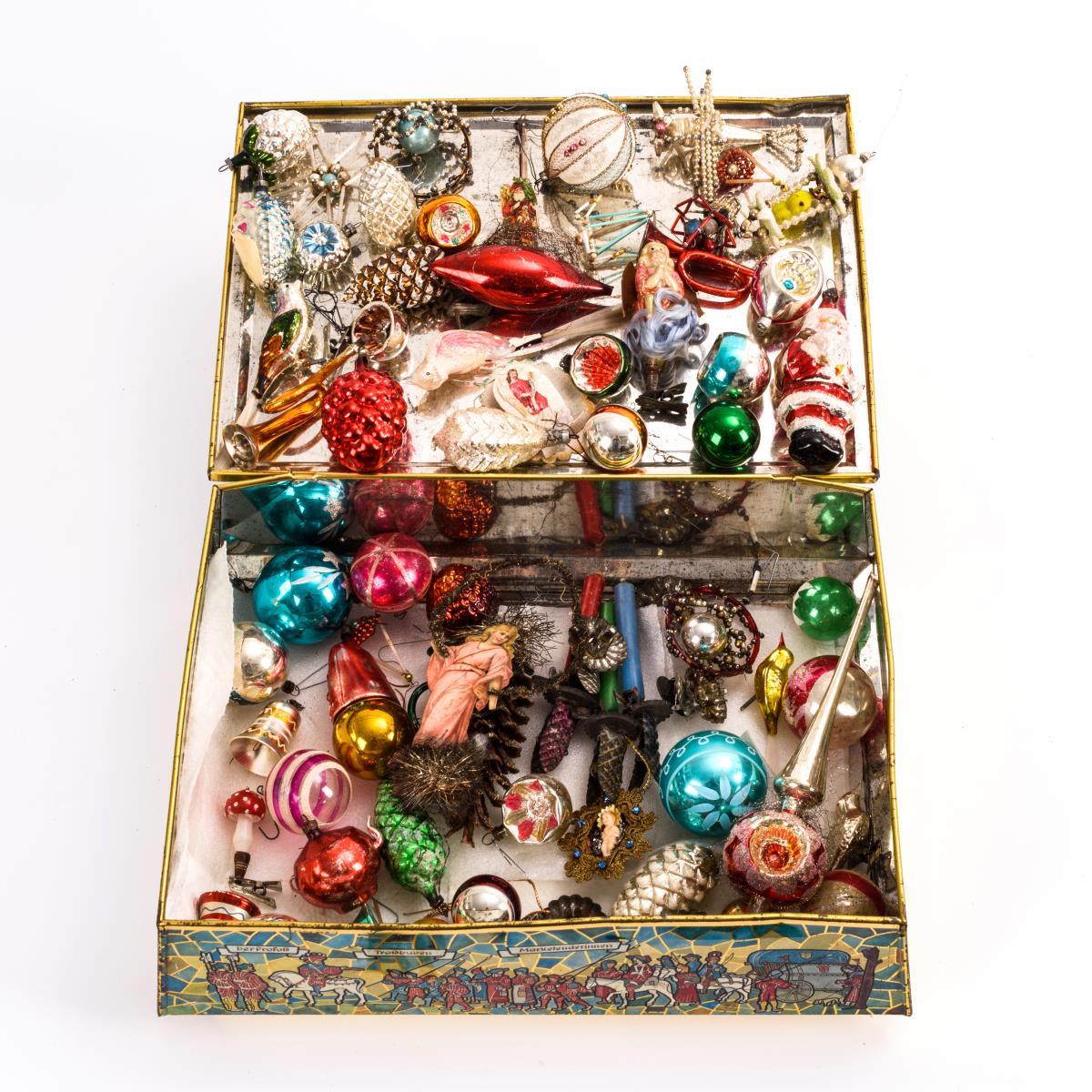 Konvolut alter Christbaumschmuck in Blechkiste.