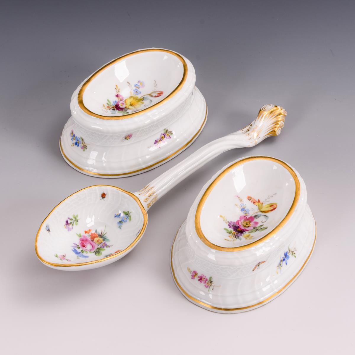 2 Salieren und Servierlöffel mit Blumen- und Insektenmalerei.