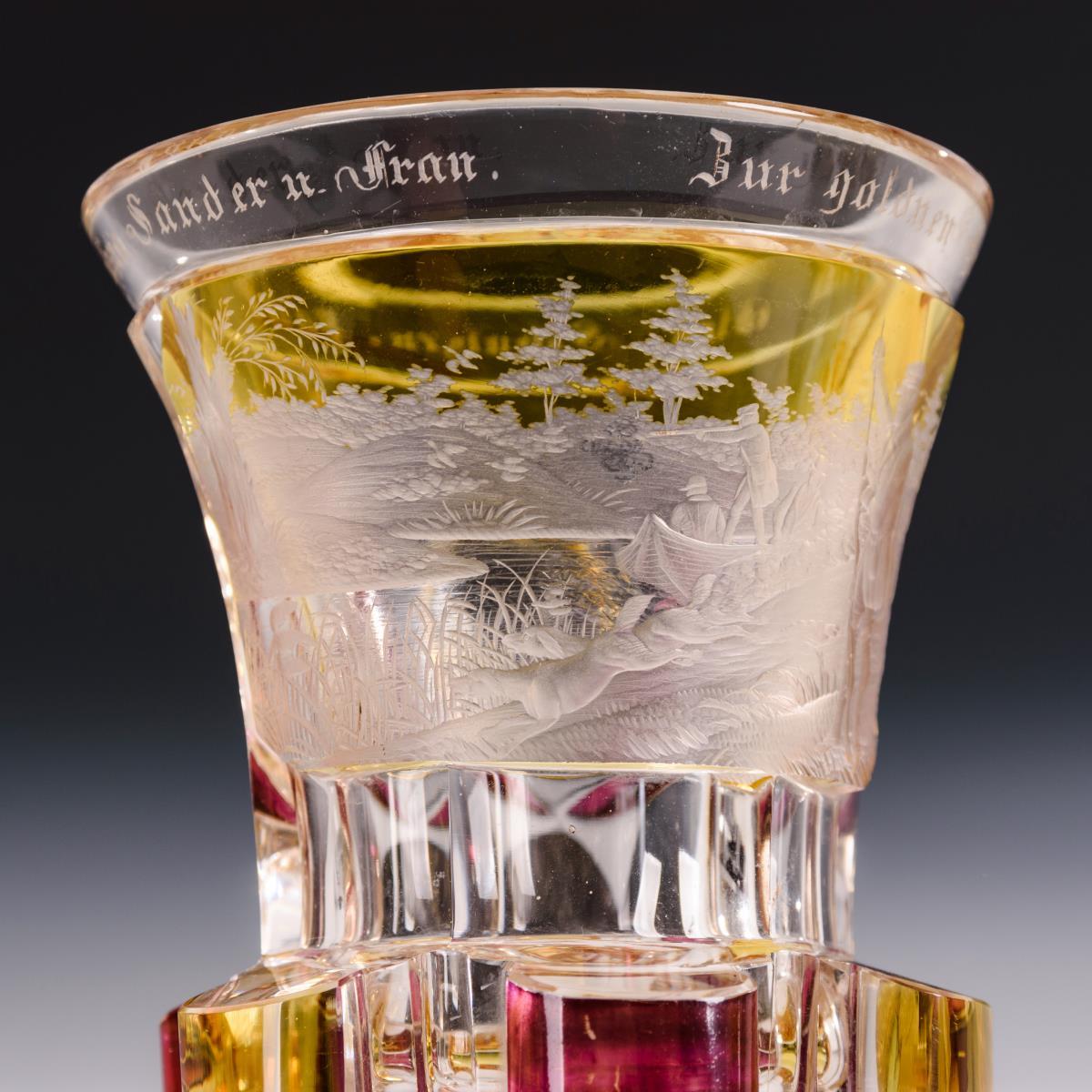 Farbloses Glas, teils gelb und purpurfarben gebeizt, Schliffdekor.
