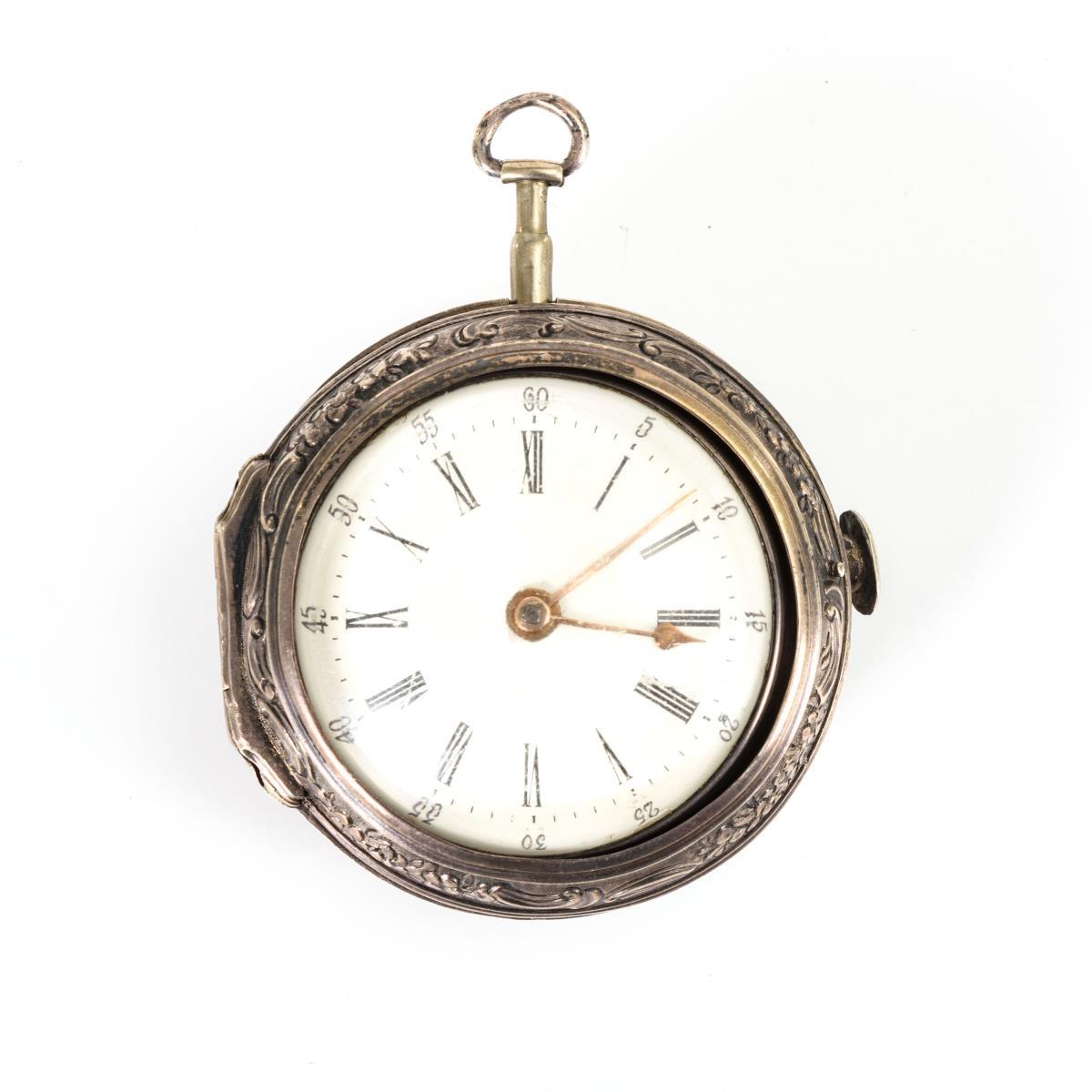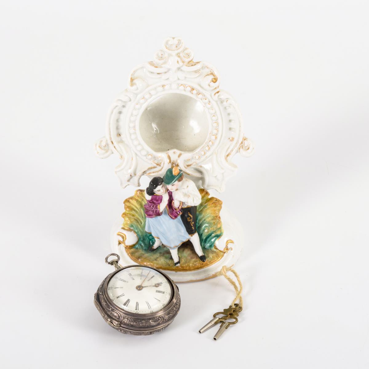 Silberne englische Taschenuhr mit Porzellan-Uhrenständer.