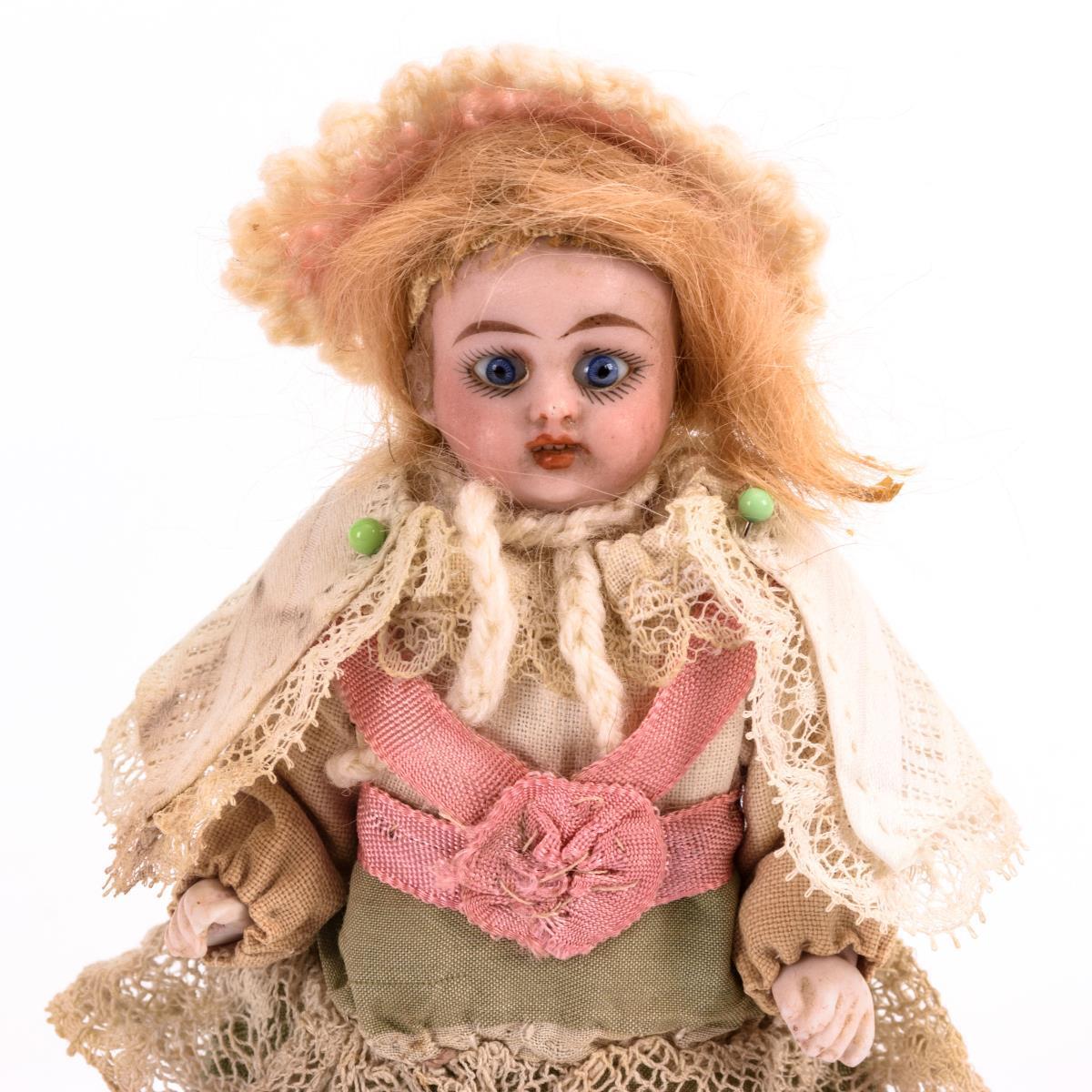 Puppenstubenpuppe mit Kleidung und Flechtköfferchen.