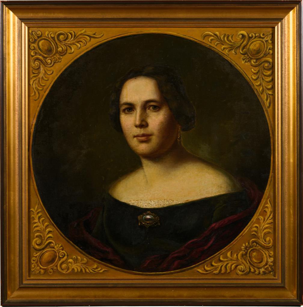 Porträt einer jungen Frau im Kleid mit Brosche und im gemalten ovalen Bildausschnitt. Leichte Altersspuren.