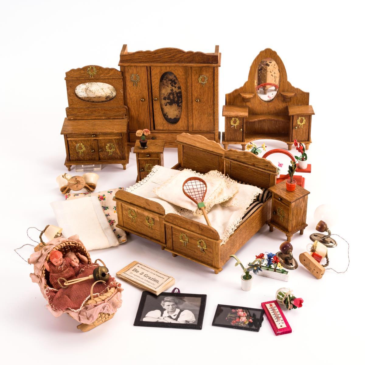 Konvolut Möbel, 2 Püppchen und Zubehör für die Puppenstube.