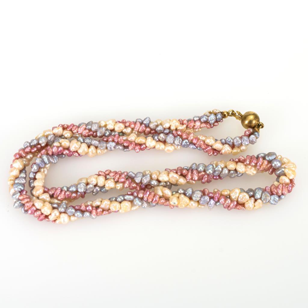 Schnürketten mit cremefarbenen, rosafarbenen und blaugrauen Zuchtperlen, an Kugelschloss.