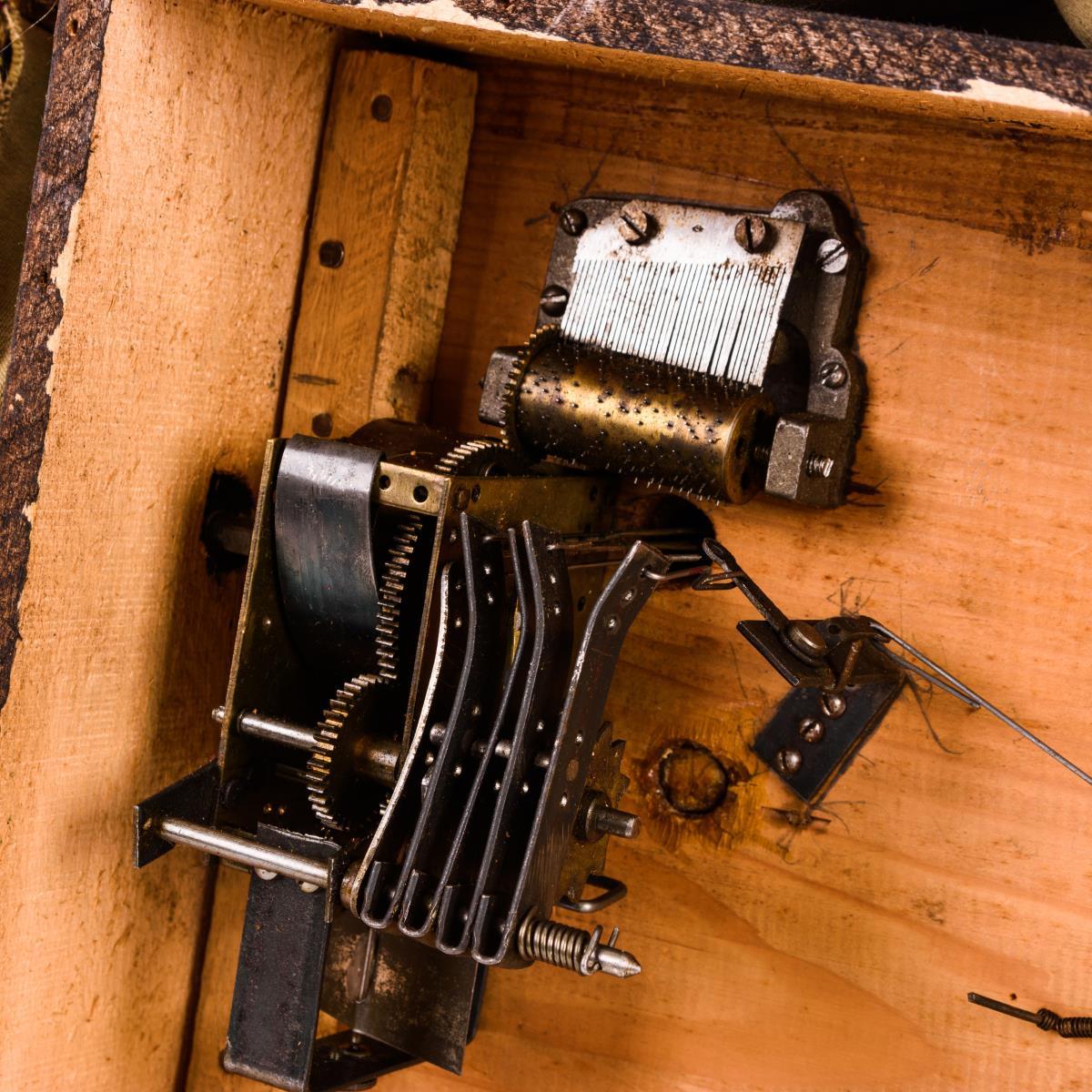 Vermutlich in den 1980er Jahren stark überarbeitet, Sockelkasten nachgebeizt, in Teilen ergänzt.Werk läuft schwergängig.