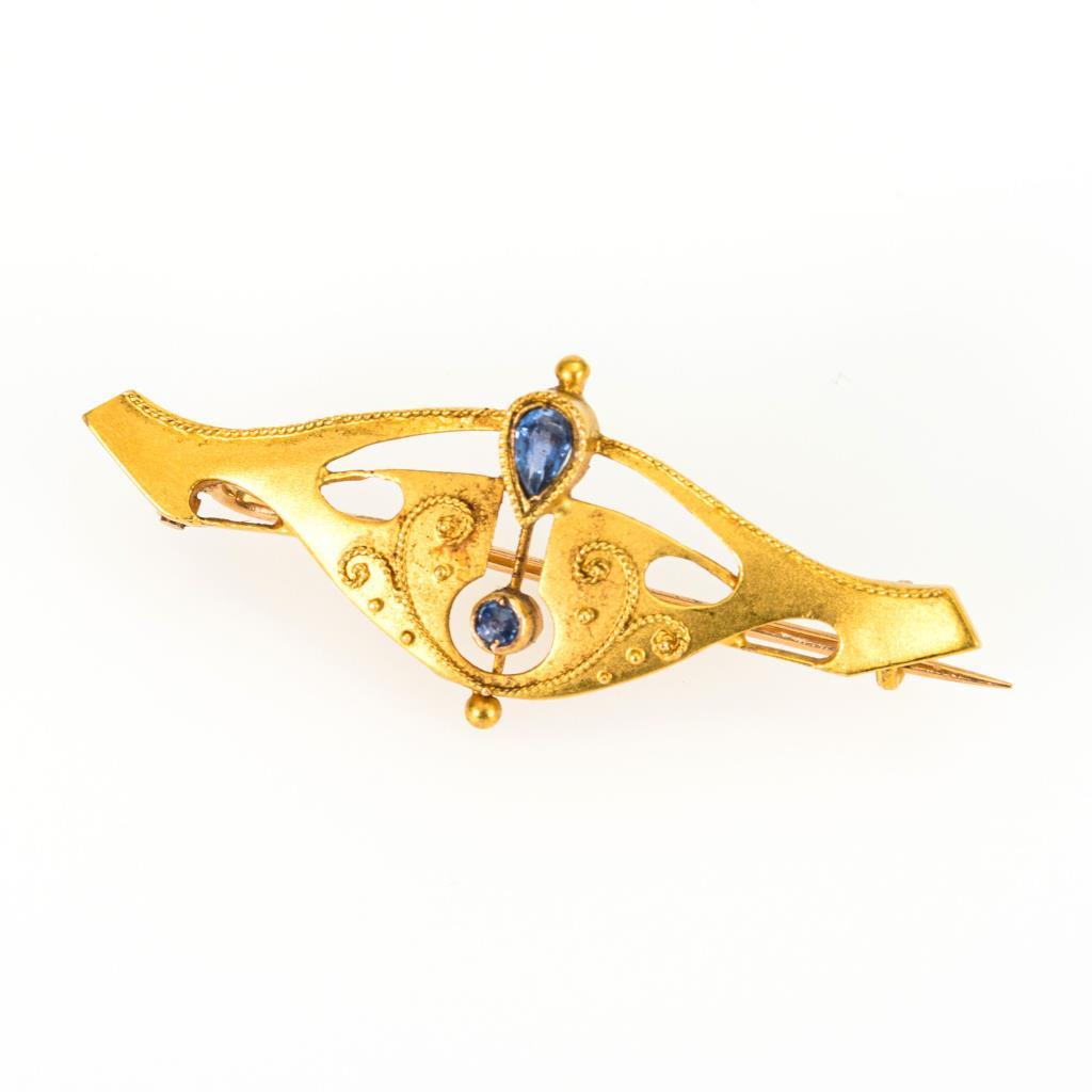 Stiltypische Brosche mit 2 kleinen Saphiren. Hakenverschluss.