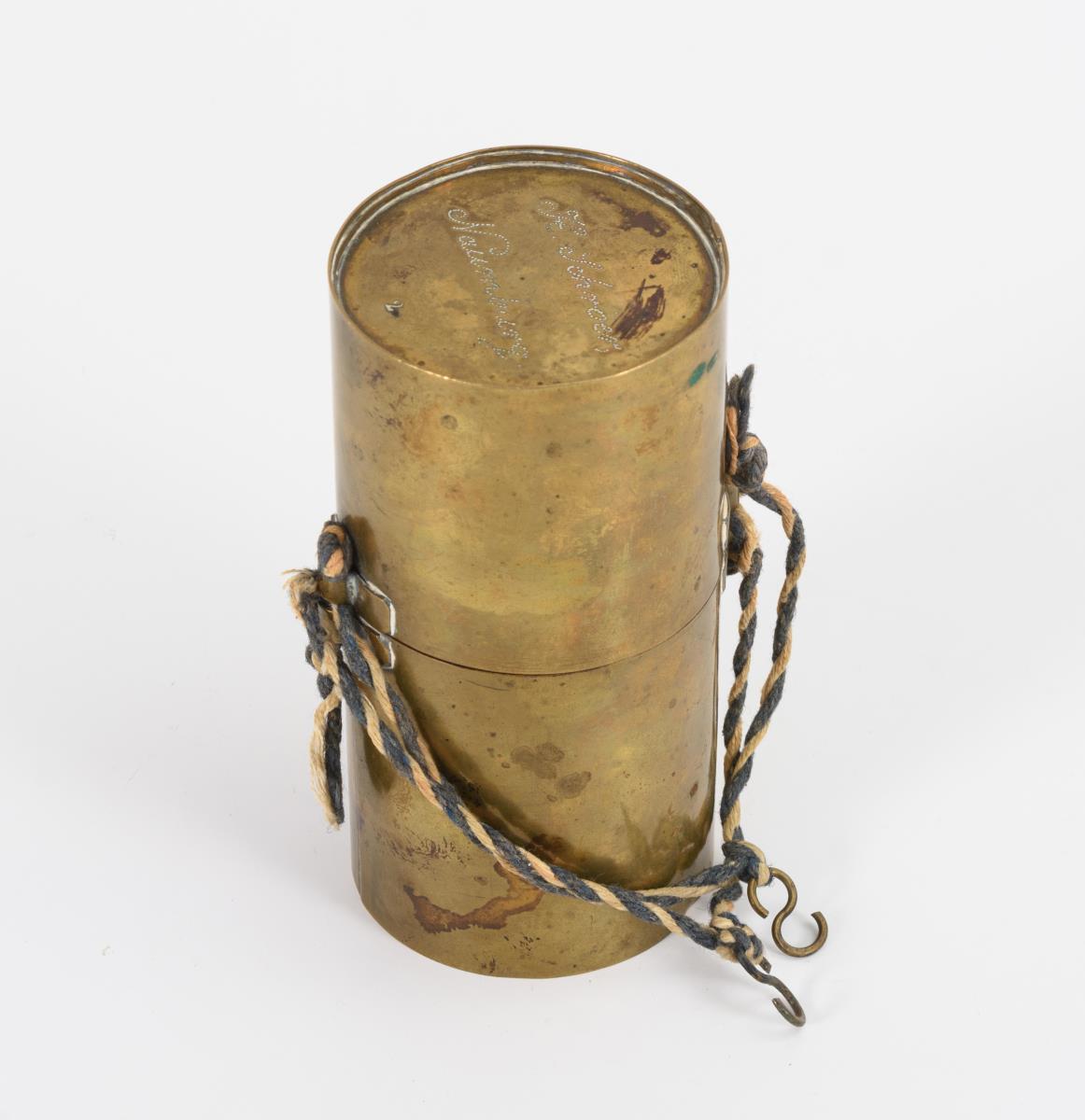 Messing außen punziert: "2 Berliner Scheffel / H. Schroer Naumburg", innen Holz mit Bezügen aus Samt und Leder.