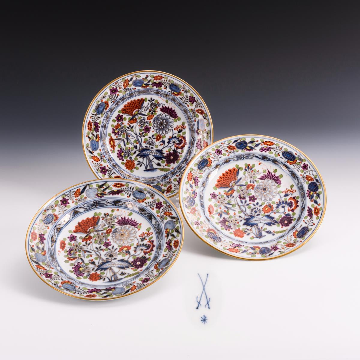 Unterglasurblau bemalt, in Rot, Purpur, Grün und Schwarz staffiert, goldstaffiert.