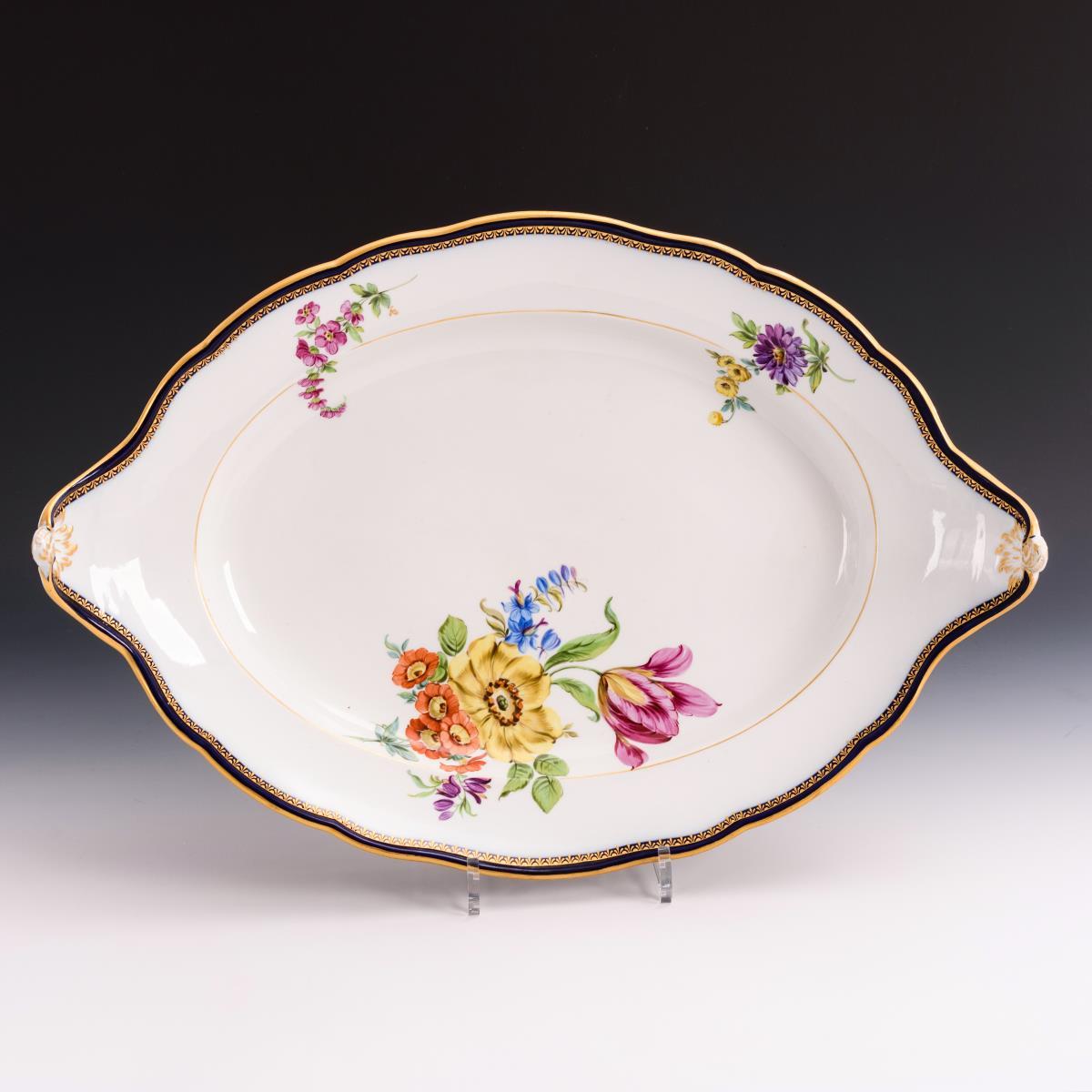 Kobaltblauer Rand, polychrome Blumenmalerei, Goldstaffage.