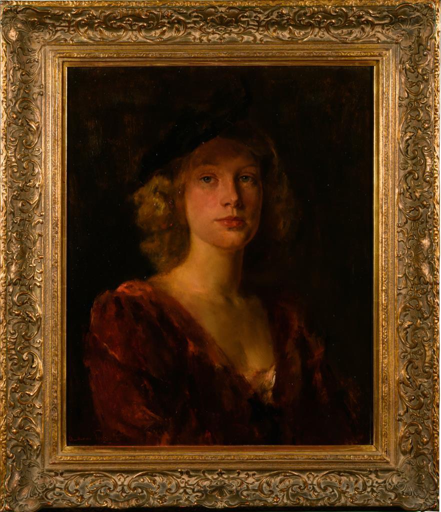 Bildnis einer jungen Frau im roten Kleid mit blonden Haaren und schwarzem Hut. Minimale Altersspuren.