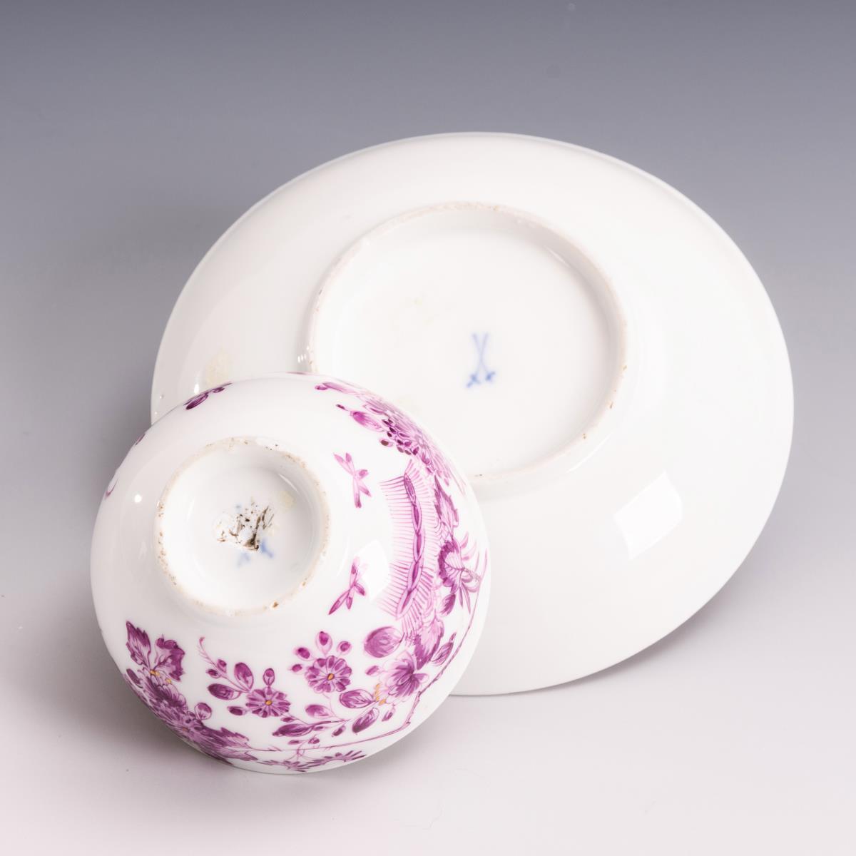 Minimale Bereibung am Mündungsrand, auf der Koppchenunterseite Porzellanausbruch (nicht durchgehend, wohl der Versuch, die Schwertermarke zu entfernen).