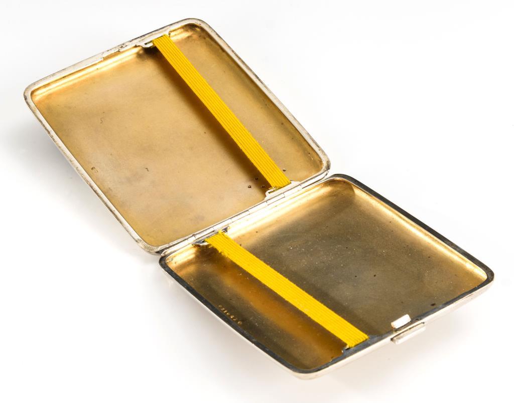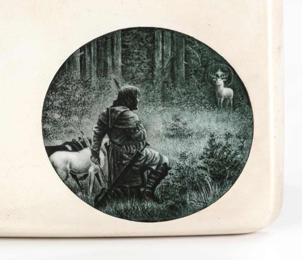 Jagdliches Zigarettenetui aus Silber mit Hubertusbild und Gold-Monogramm