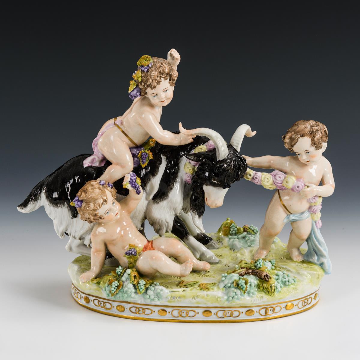 Auf einem Ziegenbock reitender Putto sowie Putto mit Rosengirlande und Putto mit Weintrauben. 1 Putto restauriert.